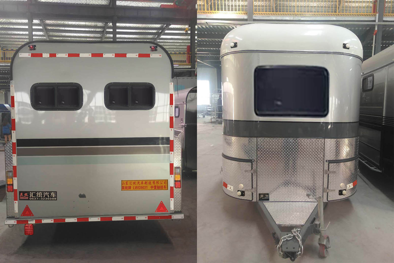 | 备注 | 1、车长/轴距/后悬尺寸对应关系为(mm):5500/3458+774/1218,5000/3158+774/1018,4500/3158+774/518。2、侧后防护装置由车身构件替代,后部离地高度为350mm。3、牵引杆深入量为50mm。 4、连接器最大负荷50kg。5、选装前部和后部样式。6、该车用于运输马匹等牲畜。 | ||