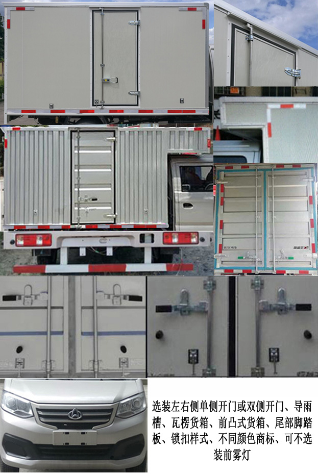 | 备注 | 1.选装部件:左右侧单侧开门或双侧开门,导雨槽,导流罩,尾部脚踏板,锁扣样式,反光膜型反光标识,瓦楞货厢(瓦楞货箱时货箱内部宽度为1650),前凸式货厢,MP5,倒车可视,电动门窗,中控锁,空调,选装不同颜色商标,可不选装前雾灯.2.DK15C发动机对应油耗值为7.5L/100km,最大净功率为78KW.3.车厢顶部封闭,不可开启.4.ABS控制系统型号/生产企业/控制方式:YF8/武汉元丰汽车电控系统有限公司/四通道式. | ||
