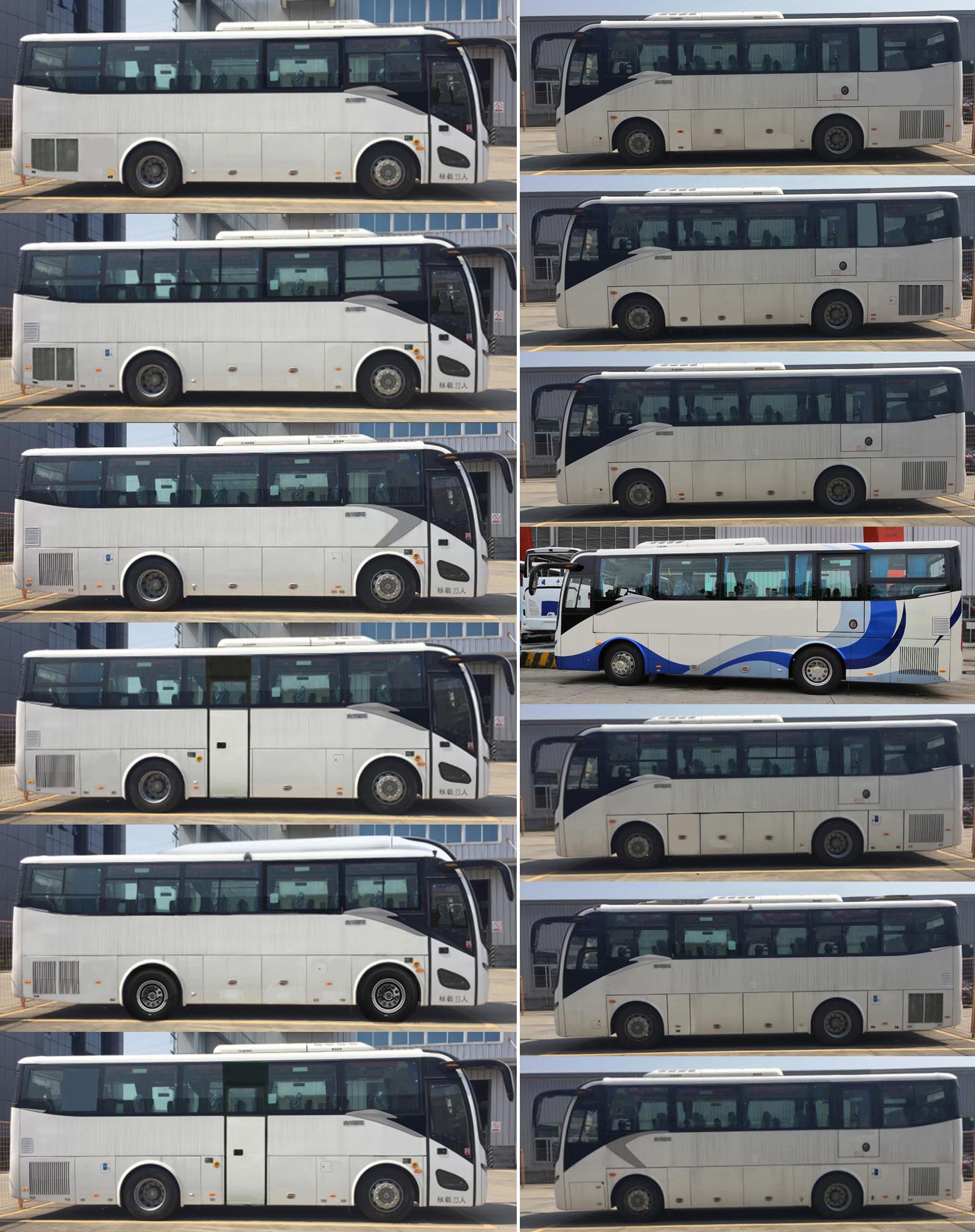| 备注 | 1.安装外推式应急窗,可组合推拉式、封闭式、局部推拉式侧窗,前乘客门选装推拉窗,选装侧围电子显示屏,选装发动机后舱门散热孔,顶排气口可选装在后顶部左侧或右侧,选装侧围造型;2.选装空调、前顶部及两侧空调挡板(车高3395mm或3420mm),可取消顶置空调(至安全顶窗车高3280mm),可取消中门(左侧设置应急门);3.选高配置时对应整备质量9800kg;4.安装带卫星定位功能的行驶记录仪;安装限速装置,限速100km/h;5.ABS系统控制器型号和厂家为:ABS-E 4S/4M,威伯科汽车控制系统(中国)有限公司;6.发动机最大净功率:194kW(YC6A270-50).7.前中门状态,左侧可选装应急门;选装侧围后部舱门格栅结构. | ||