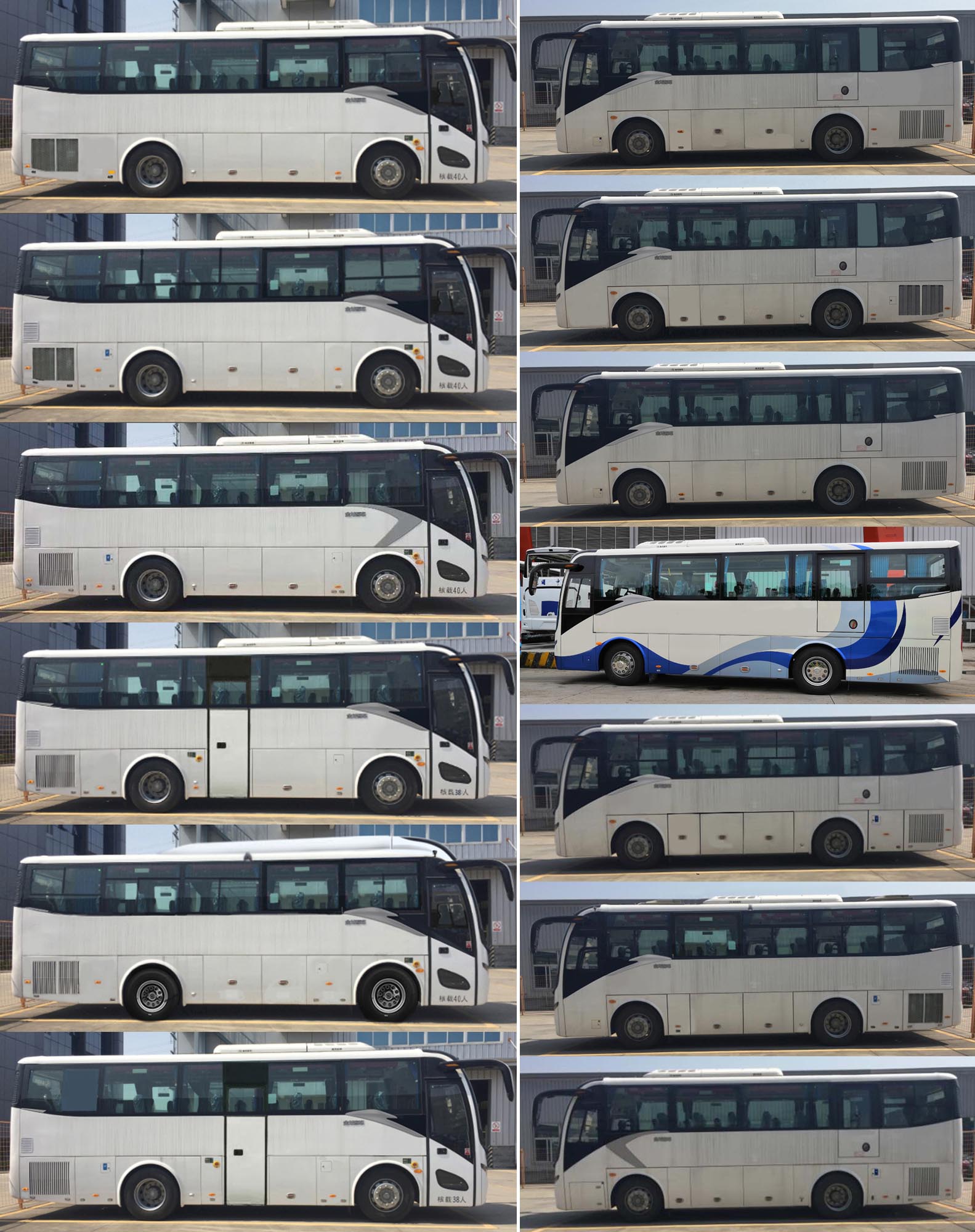 | 备注 | 1.安装外推式应急窗,可组合推拉式、封闭式、局部推拉式侧窗,前乘客门选装推拉窗,选装侧围电子显示屏,选装发动机后舱门散热孔,顶排气口可选装在后顶部左侧或右侧,选装侧围造型;2.选装前顶部及两侧空调挡板(车高3420mm),可取消顶置空调(至安全顶窗车高3385mm),可取消中门(左侧设置应急门,座位数为24-40);3.选高配置时对应整备质量9800kg;4.安装带卫星定位功能的行驶记录仪;安装限速装置,限速100km/h;5.ABS系统控制器型号和厂家为:ABS-E 4S/4M,威伯科汽车控制系统(中国)有限公司;6.发动机最大净功率:194kW(YC6A270-50),194kW(WP7.270E53);7.选装中开门状态时,额定载客人数24-38,左侧可选装应急门;选装侧围后部舱门格栅结构. | ||