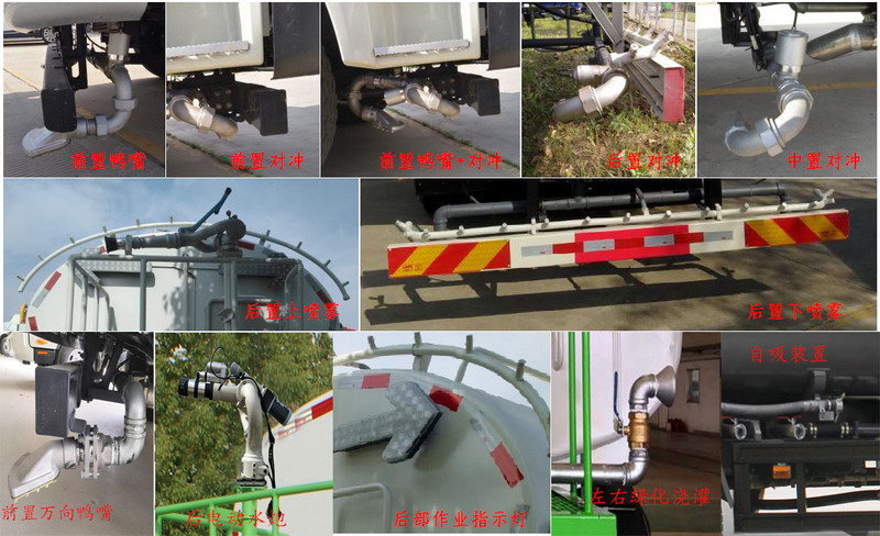 | 备注 | 该车装备有水罐,水路及作业装置,用于城镇环境清洗及清洁作业;罐体有效容积:10.5立方米,罐体外形尺寸(长轴×短轴×长)(mm):2350×1450×4600,运输介质:水,密度:1000千克/立方米;该车型工作装置有4种配置:A(车头无工作装置),B(车头选装前自动水炮装置),C(车头选装高压喷水架装置),D(车头选装护栏清洗装置);配置A时,整车长7950mm,接近角20°;配置B时,整车长8550mm,前伸600mm,接近角12°;配置C时,整车长8950mm,前伸1000mm,接近角10°;配置D时,整车长9250mm,前伸1300mm,接近角6°;可选装鸭嘴,对冲喷头,后部上下喷雾装置,后自动水炮,后部作业指示灯,绿化浇灌,自吸等装置,该系列选装对于整车尺寸,重量变化可忽略不计;侧面及后下部防护装置材料/连接方式:Q235/螺栓连接,后下部防护装置断面尺寸(高×宽)/离地高度(mm):150×50/490;ABS控制器型号/生产企业:VIE ABS-II/浙江万安科技股份有限公司,CM4XL-4S/4M/广州瑞立科密汽车电子股份有限公司;安装带卫星定位功能的行驶记录仪;选装后防护,后防护材料/连接方式:Q235/螺栓连接,后防护装置断面尺寸(高×宽)/离地高度(mm):240×60/420;选装罐体样式和后部雾炮结构;整车长8200对应后悬2300,接近角18,离去角8。 | ||