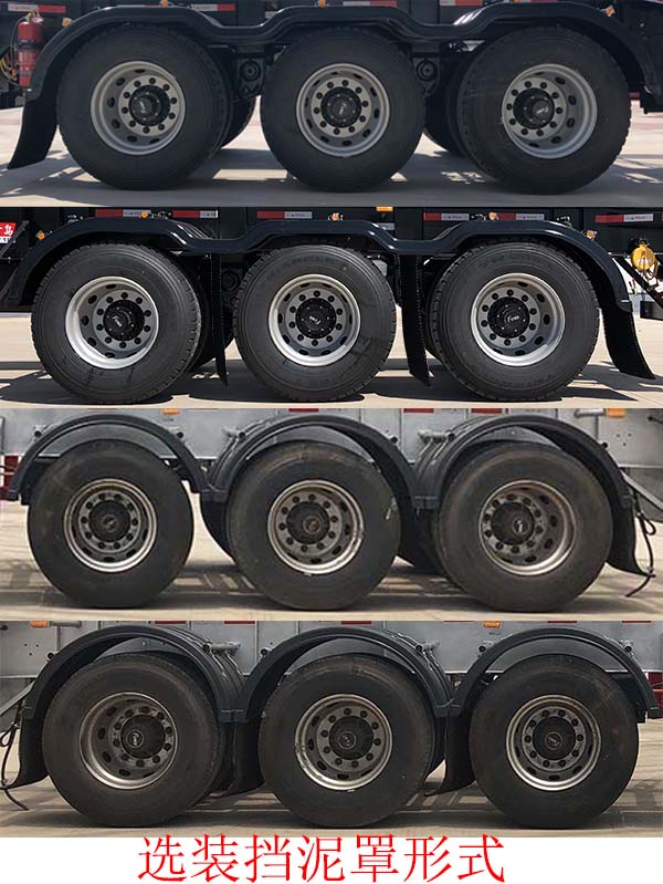 | 备注 | 1、该车用于运输一只40英尺危险品罐箱,罐箱装运的危险品类别为非剧毒化学品及爆炸品,牵引销处车架总高度90毫米。 2、车身加装灭火器,接线盘及导静电拖地带,选装空气悬挂,选装挡泥罩形式。 3、侧防护装置材料/与车辆的连结方式:Q355/螺栓连接;后防护装置材料/与车辆的连结方式/装置截面尺寸/装置下边缘离地高:Q355/焊接/160mm×70mm/490mm。 4、ABS型号:400500XXX0(选装EBS: 480102-0640),生产厂家: 威伯科汽车控制系统(中国)有限公司;或ABS型号:CM2XL-4S/2M,生产厂家: 广州瑞立科密汽车电子股份有限公司。 5、采用适用于牵引危险品运输半挂车的牵引车。 6、使用11R22.5,275/70R 22.5轮胎时,每轴均安装防飞溅雨帘;使用11.00R20,12R22.5轮胎时,最后轴安装防飞溅雨帘。 7、牵引销到车辆最前端距离/轴距/后悬对应关系/离去角: ①1020/6900+1310+1310/1700/17°; ②1250/6900+1310+1310/1470/18° | ||