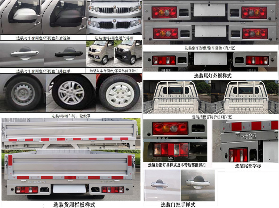 | 备注 | 选装(倒车雷达、倒车影像、与车身不同色前保险杠/门外拉手/后视镜、镀铬/黑色进气格栅、钢/铝车轮、轮毂罩、档板窗防护栏、MP5)。SWC15M发动机净功率72KW,油耗申报值6.7L/100km。ABS型号1/厂家1:APG3550500G/浙江亚太机电股份有限公司,ABS型号2/厂家2:DBC7.8/京西重工(上海)有限公司。该车型符合国六标准B阶段限值要求。 | ||
