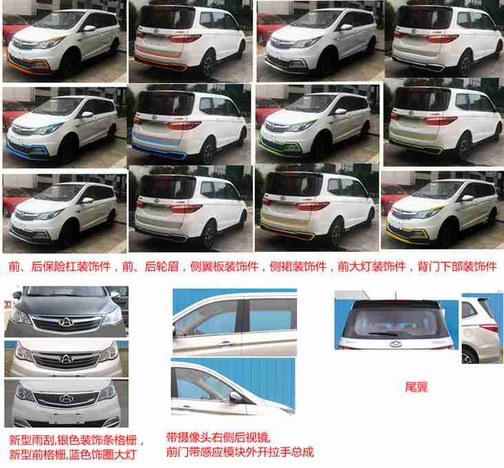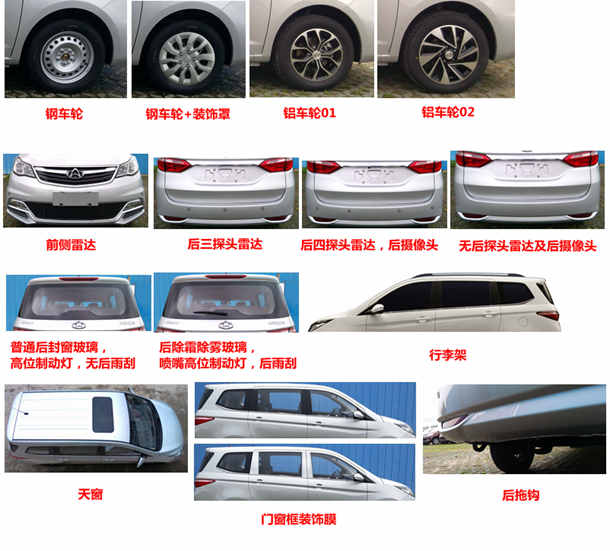 | 备注 | 选装(带摄像头右侧后视镜,前门带感应模块外开拉手总成,新型雨刮,新型前格栅,银色装饰条格栅,前、后保险杠装饰件,前、后轮眉,侧翼板装饰件,侧裙装饰件,前大灯装饰件,背门下部装饰件,尾翼,绿色玻璃,天窗,副驾安全气囊,前侧雷达,后三探头雷达,后四探头雷达,后除霜除雾玻璃,门窗框装饰膜,带喷嘴高位制动灯,铝车轮,钢车轮,黑色钢车轮,钢车轮装饰罩,后雨刮,后摄像头,后拖钩,行李架,银色后牌照灯装饰罩,黑色后视镜,黑色门窗及后侧窗外夹条,黑色门外开拉手、蓝色饰圈大灯)。选装副驾驶席安全气囊时VIN代号为LS4ASE2E×××××××××。选装前、后保险杠装饰件时整车长度为4510mm,选装行李架时整车高度为1700mm。ABS型号:MK78,MK100 ESC,ABS生产企业:大陆泰密克汽车系统(上海)有限公司。发动机最大净功率为80kW。 | ||