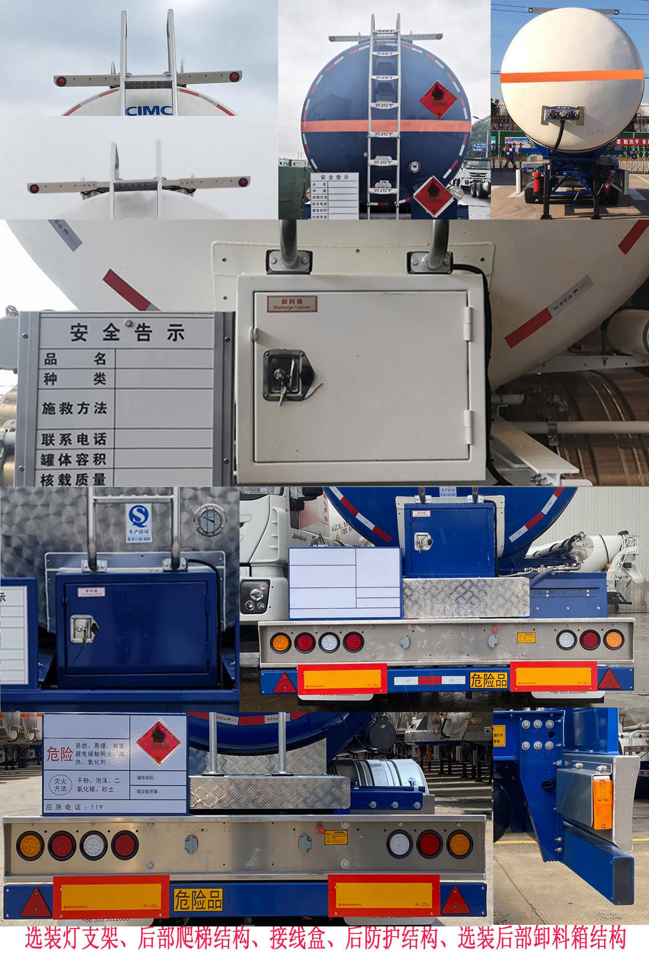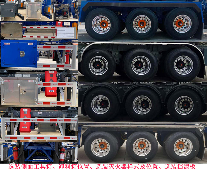 | 备注 | 罐体有效容积为43立方米,保温外胆罐体长11484mm,外径前φ2308mm,外径后φ2508mm;保温内胆罐体长11284mm,外径前φ2108mm,外径后φ2308mm,选装罐体尺寸,保温外罐体尺寸:罐长11413mm,外径前Φ2310mm,后Φ2510mm;保温内罐外形尺寸:罐长11213mm,外径前Φ2110mm,外径后Φ2310mm.外形尺寸/前悬/轴距/后悬对应关系(mm):11940/1720/6000+1310+1310/1600;12040/1720/6100+1310+1310/1600;12040/1820/6000+1310+1310/1600;12120/1800/5800+1310+1310/1900.运输车辆类型为FL,类项号:3.选装顶部结构,挡泥板,灯支架,多种胶管箱,选装多种保温蒙皮,选装空气悬挂,选装安全告示牌位置,选装工具箱位置.ABS生产厂为威伯科汽车控制系统(中国)有限公司,型号为4005000810;克诺尔商用车系统企业管理(上海)有限公司,型号为K068353XXX,EBS生产厂为克诺尔商用车系统企业管理(上海)有限公司,型号为K11061XVXX,ABS生产厂为广州瑞立科密汽车电子股份有限公司,型号为CM2XL-4S/2M.侧、后防护材质均采用铝合金,侧、后防护连接方式均为螺栓装配式,离地高度为480mm,后部防护装置的断面尺寸(mm):300×80.牵引车采用适用于牵引危险品运输半挂车的牵引车. | ||