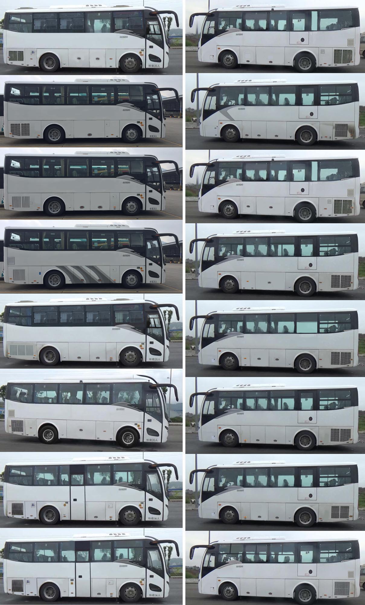 | 备注 | 1.安装外推式应急窗,可组合推拉式、封闭式、局部推拉式侧窗,选装发动机后舱门散热孔,进气口可选装在后顶部左侧或右侧;2.选装前顶部及两侧空调挡板引起高度变化,可取消顶置空调(至安全顶窗车高3270mm);3.可选装中门(座位数为24-34,左侧可选装应急门或无应急门);可取消中开门(座位数为24-36,左侧设置应急门);4.选高配置时对应整备质量8800kg;5.安装带卫星定位功能的行驶记录仪;安装限速装置,限速100km/h;6.ABS系统控制器型号和厂家为:ABS-E 4S/4M/威伯科汽车控制系统(中国)有限公司;7.发动机最大净功率:165kW(YCK05230-60),158kW(WP4.6NQ220E61).油耗申报值(L/100km):19.1(YCK05230-60),19.1(WP4.6NQ220E61);8.该车不作为公路、旅游客车使用;9.选装侧围后部舱门格栅结构; | ||