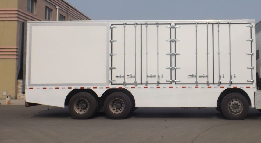 | 备注 | 车厢顶部封闭,不可开启。随底盘选装驾驶室,选装侧围板代替侧防护。该车侧防护装置所用材料为铝材质,与车架螺栓连接。车厢后部为折叠液压尾板,后防护由液压尾板代替,离地高度410mm。ABS系统型号为4460046300,生产企业为威伯科汽车控制系统(中国)有限公司。当轴距为1800+4575+1400时外形尺寸为11845×2500×3750货箱内尺寸为9065×2360×2455。当轴距为1800+3775+1400时外形尺寸为11045×2500×3750货箱内尺寸为8265×2360×2455。选装瓦楞板箱体、液压围板。 | ||