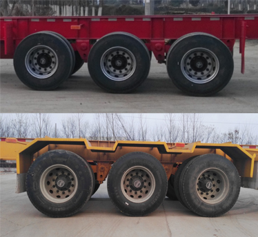 | 备注 | 该车用于运输一只45英尺集装箱或罐式集装箱,该车车架为小鹅颈结构,牵引销处车架高度132mm,150mm,170mm,180mm或210mm。选装空气悬架;选装挡泥板;选装前部结构,前横梁上选装导向块结构。质量变化是由板簧选装引起。选装导向块引起车辆高度变化,但不影响车辆任何性能,选装两侧工具箱数量和安装位置,选装不同车身颜色.侧防护所用材料材质为Q235,侧防护与车架连接方式为焊接连接,车体右侧的工具箱结构符合侧防护要求,未单独加装;后防护所用材料材质为Q235,与车架连接方式为焊接,后防护断面尺寸为160×60毫米,后防护离地高度为530毫米。该车装有梁山海纳电子科技发展有限公司的HNABS4S/4M型ABS。 | ||