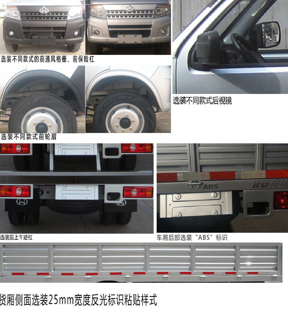 | 备注 | 1,带IUPR,选装不同款式的前保险杠、前通风格栅、前轮眉;选装不同款式后视镜;车厢后部选装"ABS"标识;选装后上车踏杠;选装去掉货厢后部上端的胶堵;选装不同款式的仓栅结构;选装货箱侧面25mm宽度反光标识;2,发动机净功率76.5kW;3,ABS型号:WX80,生产企业:浙江万向精工有限公司;4,DAM15R型号发动机的油耗申报值为7.9L/100km;5,货箱底板到仓栅高度为1630mm. | ||