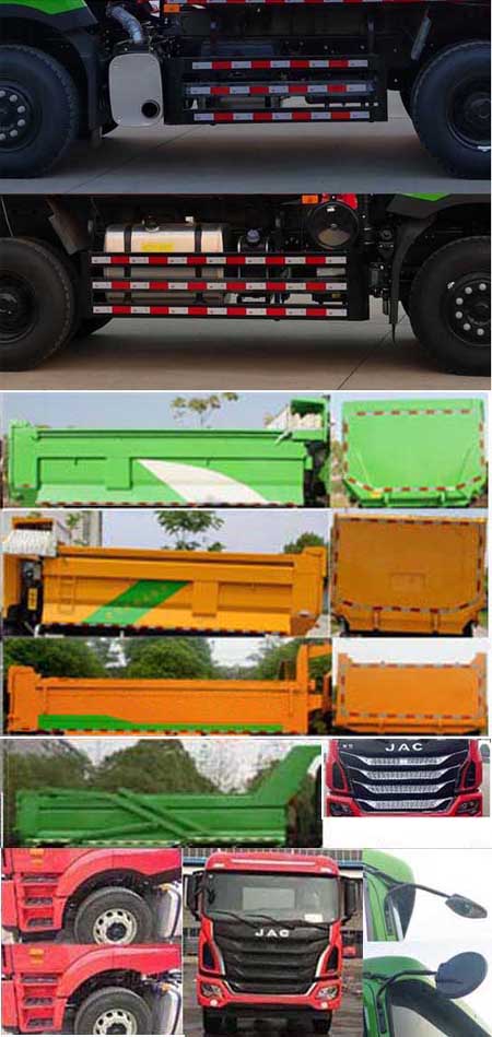 | 备注 | 1.随底盘选装前面罩,前保险杠和前组合灯,选装后视镜,选装前下视镜;2.侧防护材料材质为Q235,连接方式:螺栓连接,后防护材料材质为QSTE650,连接方式:焊接,后防护离地高度为410mm,截面尺寸为150mm×75mm;3.安装带卫星定位功能的行驶记录仪;4.发动机WP10.350E53,D10.38-50,D10.34-50,WP12.375E50,WP10H375E50,WP12.400E50,WP12.430E50的油耗申报值(L/100km)分别为41.2,41.2,41.2,41.2,41.2,41.2,41.2;5.ABS控制器型号/生产企业:VIE ABS-II/浙江万安科技股份有限公司,CM4XL-4S/4M/广州科密汽车电子控制技术股份有限公司;6.选装多种货箱外观结构,选装环保箱盖,选装带环保篷布软帘和不带环保篷布软帘2种形式,自卸方式为后卸式;7.外形尺寸长/轴距/前后悬/货箱长(mm)对应关系:8285/3690+1350/1495/1750/5400,8495/3690+1350/1495/1960/5600,8495/3900+1350/1495/1750/5600,8595/3900+1350/1495/1850/5800,8285/3690+1350/1585/1660/5400,8495/3690+1350/1585/1870/5600,8495/3900+1350/1585/1660/5600,8595/3900+1350/1585/1760/5800;8.随选装三级脚踏板;9.选装侧防护结构. | ||