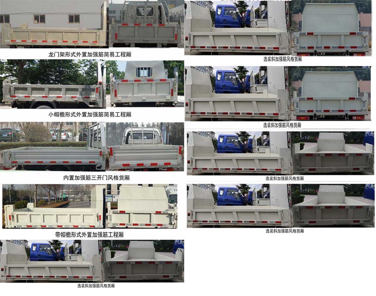 备注 | 后卸,侧面防护装置材料为Q235,后下部防护装置材料为Q235,均为螺栓连接,后下防护装置截面尺寸100mm×50mm,后防护距离地面的高度为365mm;ABS系统控制器型号为CM4XL-4S/4M,ABS系统控制器生产企业为广州瑞立科密汽车电子股份有限公司;发动机4A2-88C50对应的油耗值为12.4L/100km;选装前雾灯及不带昼间行驶灯,选装不带前雾灯及不带昼间行驶灯,选装龙门架形式外置加强筋简易工程厢,选装小帽檐形式外置加强筋简易工程厢,选装加强筋三开门风格货厢.再次选装货箱风格。 |