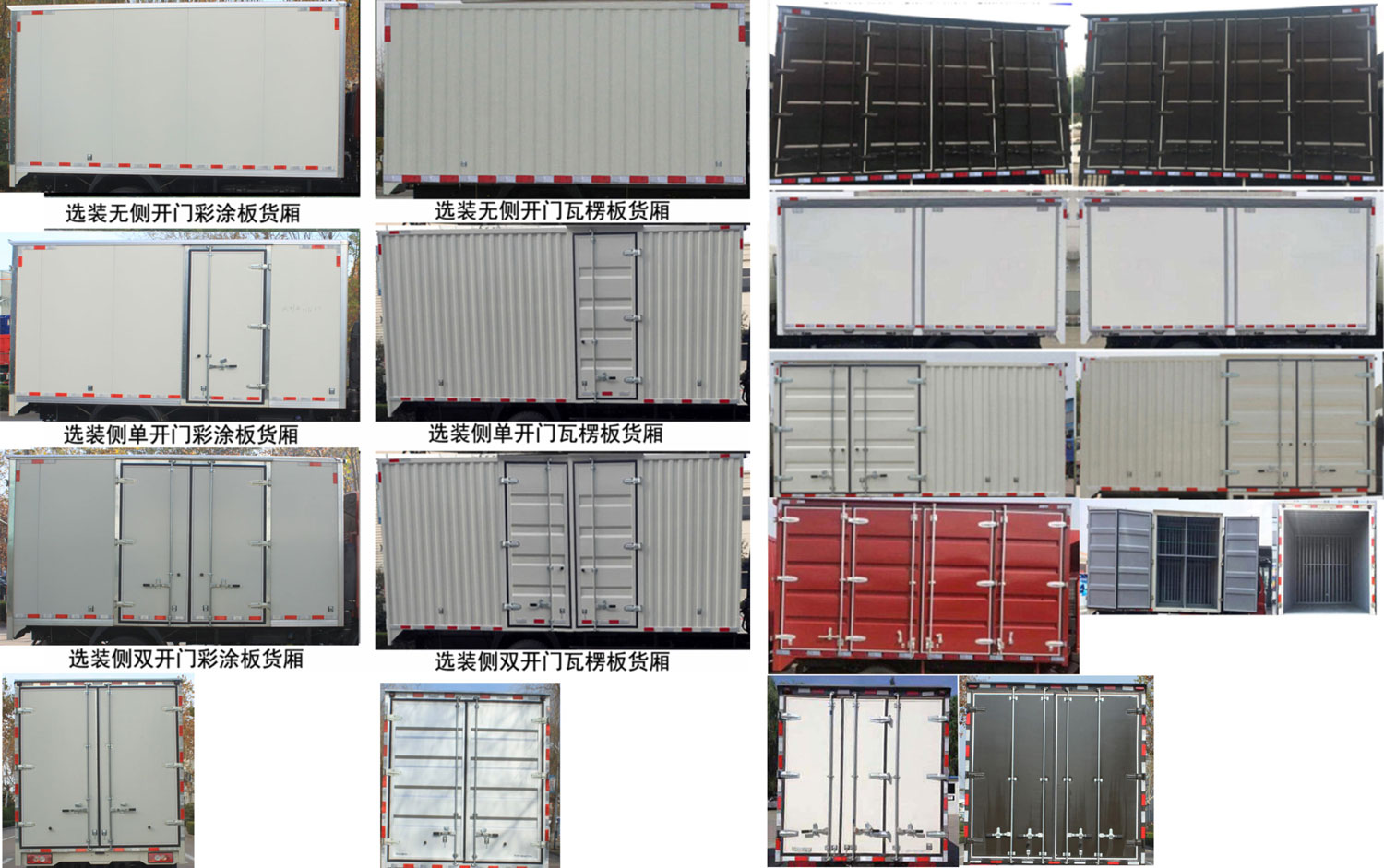| 备注 | 货箱顶部封闭不可开启.侧面防护装置的所用材料材质为冷板B-2.0-GB/T708,后下部防护装置的所用材料材质为异型管20-D-1-100×50×3,支架材料为热板A-6/Q235A,连接方式为螺栓连接,位置不可调整,后部防护装置的断面尺寸为100×50mm,离地高度为372mm.ABS系统控制方式为4S/4M,ABS型号为CM4XL-4S/4M,生产厂家为广州瑞立科密汽车电子股份有限公司.发动机Q28-130E60,Q28-130C60油耗值对应12.3,11.4L/100km.选装货箱风格,可选装无侧开门彩涂板货厢,侧单开门彩涂板货厢,侧双开门彩涂板货厢,无侧开门瓦楞板货厢,侧单开门瓦楞板货厢,侧双开门瓦楞板货厢.可选装双侧对称开门风格,可选装双侧八开门风格货箱,可选装内部隔断,可选装后部开门风格,选装液压尾板,尾板收起状态的水平长度为280mm.扩展前格栅风格.选装新前格栅及新logo. | ||