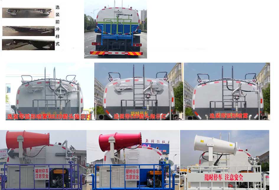 | 备注 | 运输介质:水,密度:1000千克/立方米,罐体有效容积:10.97立方米.整车长(mm)/前悬(mm)/轴距(mm)/后悬(mm)的对应关系分别为:8600/1400/4500/2700,8600/1430/4500/2670,8600/1400/4700/2500,8600/1430/4700/2470,8900/1400(1430)/5000/2500(2470).罐体外形尺寸(长×长轴×短轴)(mm):4900×2250×1450,4900×2100×1400,4700×2300×1480,5200×2200×1400,5200×2050×1350,5000×2200×1450.侧、后防护装置材料材质为Q235,侧、后防护装置与大梁用螺栓联接,后防护断面尺寸(宽×高)为60×120(mm),离地高度为500mm. ABS型号/生产厂家:3631010-C2000/东科克诺尔商用车制动系统(十堰)有限公司,ABS 8/东科克诺尔商用车制动系统(十堰)有限公司, 4460046450/威伯科汽车控制系统(中国)有限公司.随底盘选装驾驶室.选装后部样式及喷洒装置,选装带弧形喷雾和LED箭头指示灯.选装前冲样式,选装后部风机样式.专用装置:罐体,主要用于路面洒水及园林绿化. | ||