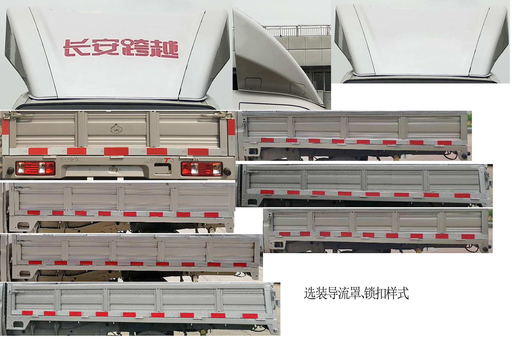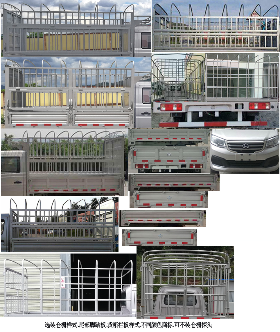| 备注 | 1.选装部件:仓栅样式,锁扣样式,尾部脚踏板,MP5,倒车可视,导流罩,电动门窗,中控锁,空调,货箱栏板样式,选装不同颜色商标,可不装仓栅探头.2.LJ469Q-AEB发动机对应油耗值为6.7L/100km,最大净功率为62kW.3.货箱底板至仓栅顶部高度为1550时整车高度为2390.4.ABS控制系统型号/生产企业/控制方式:YF8/武汉元丰汽车电控系统有限公司/四通道式. | ||