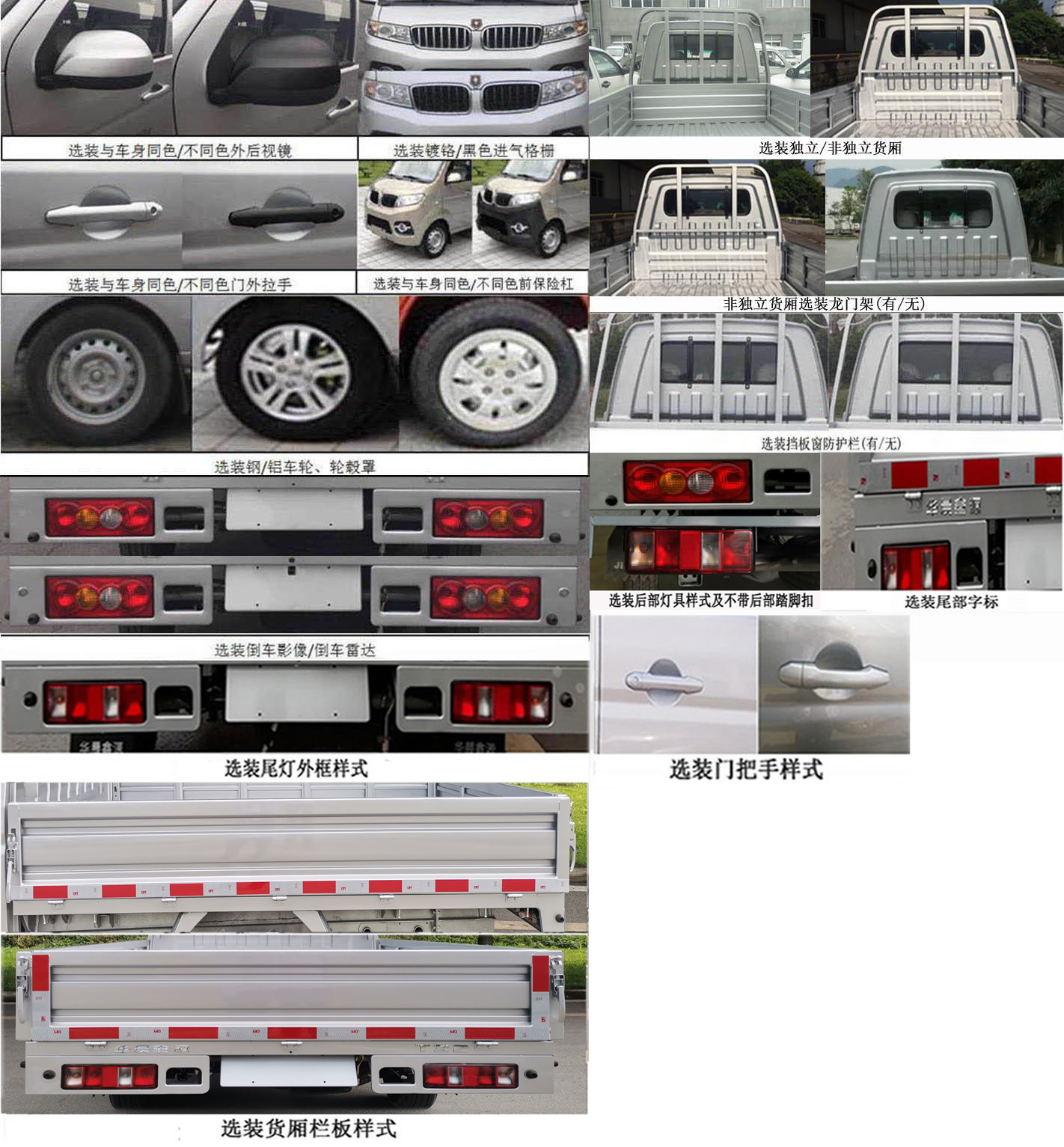 | 备注 | 选装(倒车雷达、倒车影像、与车身不同色前保险杠/门外拉手/后视镜、镀铬/黑色进气格栅、钢/铝车轮、轮毂罩、档板窗防护栏、独立/非独立货厢、非独立货厢龙门架、MP5)。装配非独立货厢对应的整车尺寸(mm)/货厢尺寸(mm):5000×1680×1925,2000/2300×1580×420。SWC15M发动机净功率72KW,油耗申报值6.7L/100km。ABS型号1/厂家1:APG3550500G/浙江亚太机电股份有限公司,ABS型号2/厂家2:DBC7.8/京西重工(上海)有限公司。该车型符合国六标准A阶段限值要求。 | ||