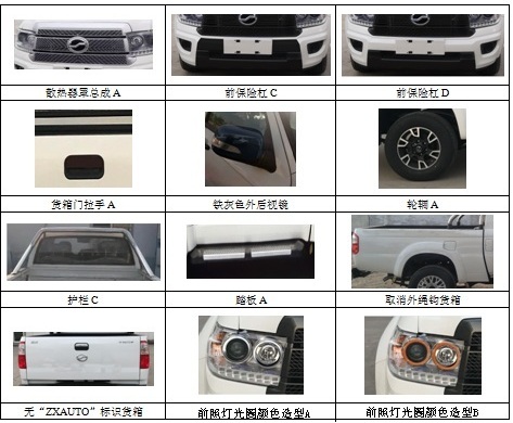 | 备注 | 选装前雾灯、前保险杠A、昼间行车灯、前保险杠B、无骨雨刮、金色LOGO、后保险杠A、倒车影像、后保险杠B、护栏A、踏板、电镀外拉手、电镀水切、不锈钢护栏B、另一种前部颜色造型。前雾灯、踏板、昼间行车灯可不装。选装后保险杠A时整车长度为5357,后悬为1350;选装后保险杠B时整车长度为5337,后悬为1330。ABS型号为APG3550500G,生产企业为浙江亚太机电股份有限公司。发动机净功率105kW。 | ||