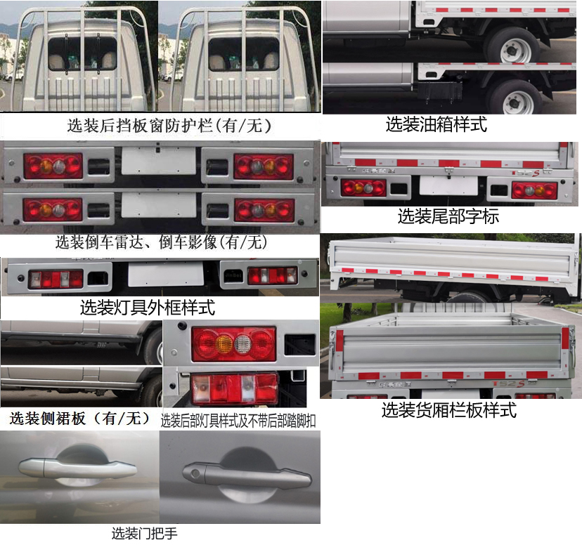 | 备注 | 1.选装(后挡板窗防护栏,倒车雷达,倒车影像,MP5);2.发动机型号SWD16M,最大净功率80kW,油耗申报值7.9L/100km;3.ABS型号/生产企业:YF8/武汉元丰汽车电控系统有限公司;4.该车型符合国六标准b限值要求。 | ||