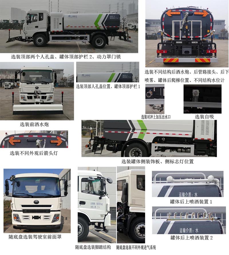 | 备注 | 1、该车型罐体有效容积9.4立方米,介质名称:水,密度:1000千克/立方米,罐体外形尺寸(长×长轴×短轴)为4360×2390×1390(mm);2、该车型有4种配置:A(车前无装置),B(有前鸭嘴),C(车前有洒水炮),D(车前有喷水架);A配置时,整车长度为8480mm,接近角16°;B配置时,整车长度为8480mm,接近角13°;C配置时,整车长度为9060mm, 接近角13°,前伸为580mm;D配置时,整车长度为9460mm, 接近角9°,前伸为980mm;3、该车仅选用4500mm轴距;4、整备质量为8700kg时对应额定载质量9170kg,整备质量为8900kg时对应额定载质量8970kg;5、侧防护装置材料为Q355,与车辆采用螺栓连接;后防护装置材料为QStE700TM,与车辆采用螺栓连接,截面尺寸为:160×120(mm),离地高度为:480mm;6、随底盘选装驾驶室前面罩、脚踏结构、不同外观进气系统;7、可选装前洒水炮、不同结构后洒水炮、后管路接头、后下喷雾、罐体后爬梯位置、不同结构水位计、动力罩门锁、罐体侧装饰板、侧标志灯位置、顶部人孔盖位置、顶部两个人孔盖、罐体顶部护栏1或2、罐体后上喷洒装置1或2、对冲上加压出水口、自吸、不同外观后箭头灯;8、该车型卷管盘、前喷水架、后上喷雾、后侧喷、后洒、后洒水炮、前鸭嘴、后箭头灯、左侧加水口、后管路消防栓接口、前角喷、倒车摄像头、工具箱为选装件,可取消;9、该车装有罐体总成专用装置,用于清理路面、管道沉积物或清洗物体;10、随底盘装有ABS,ABS型号/生产厂家: ABS-E 4S/4M威伯科汽车控制系统(中国)有限公司。 | ||