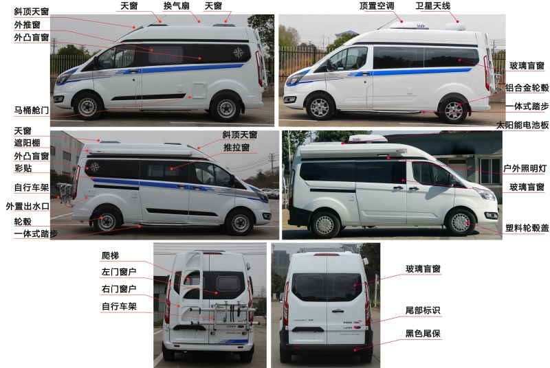 | 备注 | 选装太阳能板、一体式踏步、顶置空调、换气扇、卫星天线、车身两侧后侧盲窗、单侧或双侧拉门踏板、天窗、斜顶天窗、外凸盲窗、马桶舱门、推拉窗、遮阳棚、尾门爬梯、自行车架、彩贴、户外照明灯、外置出水口,随底盘选装轮辋样式、前脸、后保、侧拉窗、后视镜、侧拉门踏板、尾部标识。随底盘选装中顶车高2407mm,选装换气扇车高2480mm,选装卫星天线车高2560mm,选装顶置空调车高2680mm。选装自行车架车长5800mm,对应前悬/后悬1014/1486;选装后爬梯车长5465mm,对应前悬/后悬1014/1151。选装单侧踏板车宽为2080mm,选装双侧踏板车宽为2095mm。4-5座车辆整备质量2620Kg或2720kg,6座车辆整备质量2820Kg。车辆配备液晶显示屏、微波炉、洗手池、冰箱、空调、卧具等旅居生活设施和娱乐设施。ABS系统控制器型号:EV5051,生产厂:博世汽车部件(苏州)有限公司,发动机最大净功率为147kW。 | ||