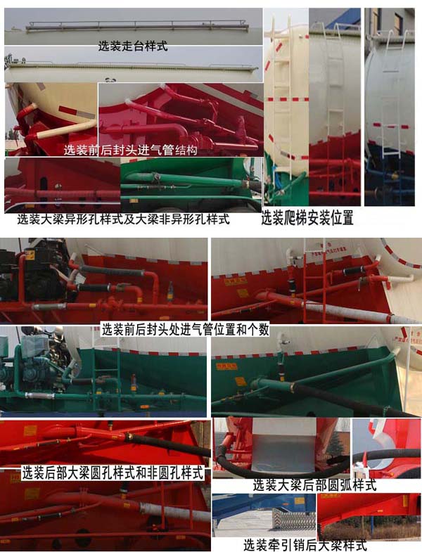 | 备注 | 该车顶部封闭,不可开槽,后部不可开启.罐体有效容积:27立方米;罐体外形尺寸:罐体长(含封头)9360mm,最大截面宽2500mm;最大截面高度3210mm.封头直径2000mm.运输介质:固井水泥(密度:1200千克/立方米).选装走台样式,选装前后封头进气管结构样式,选装大梁异形孔及大梁非异形孔样式,选装爬梯安装位置,前端选装不带空压机,不带机组时长度9400mm,轴距5380+1310+1310mm, 5280+1310+1310mm.整备质量;8100kg;带空压机时长度10100mm轴距5380+1310+1310mm, 5280+1310+1310mm,整备质量;8900kg选装爬梯的安装个数和位置及轮罩样式侧,后防护材料均采用Q235,连接方式为:焊接,后防护截面尺寸为140×53mm,后防离地高度为480mm.ABS系统生产厂家为:梁山海纳电子科技发展有限公司,ABS型号规格为: HNABS4S/4M. | ||