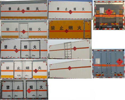 | 备注 | 厢体顶部封闭,不可开启;运输具有独立容器(瓶)包装的:液粘合剂,涂料,涂料溶液,煤油,苯,甲醇,乙醇,丙酮,甲苯,二甲苯,机油,类项号3;该车为危险品货物运输车;厢体选装瓦楞板结构,厢体侧面选装开门型式及位置或不带侧开门,选装百叶窗,选装后部双拉杆结构,选装液压尾板(收起状态水平长度为290mm);仅采用前轮盘式制动器,前置排气管,子午线轮胎,限速装置的底盘,限速80km/h;后轴仅采用空气悬架;该车安装具有卫星定位功能的行驶记录仪;ABS系统生产厂家,型号 :焦作博瑞克控制技术有限公司,J ABS;侧面防护及后下部防护装置材料材质:Q235,连接方式:焊接加螺栓连接;后下部防护装置断面尺寸(宽×高):50×120(mm),离地高度:495mm. 该车后轴为采用空气悬架. | ||