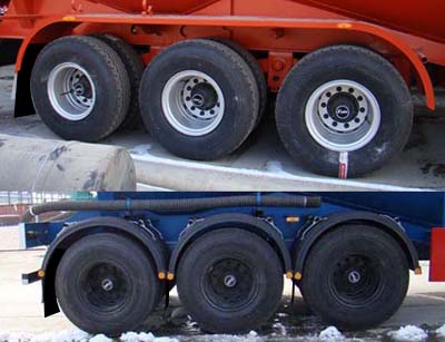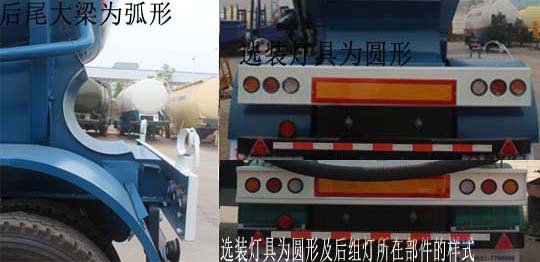 | 备注 | 罐体有效容积:26.8立方米,运输介质:固井专用水泥,介质堆密度为:1200千克/立方米,罐体尺寸含封头长9560mm,最大截面高度为:2730mm,最大截面宽度:2490mm,前后封头直径:1900mm,选装前部不加装机组时外形尺寸为9950*2500*3990,选装轮罩样式,选装灯具型号,选装后组合灯所在部件的样式,选装大梁后部可以为弧形,选装工具箱可以安装在一侧也可以两侧安装,当车长为10700时,轴距为:6110+1310+1310,5900+1310+1310,后悬为:-/770,轴距为:5900+1310+1310,后悬为:-/830,当车长为9950时,轴距为:6110+1310+1310,5900+1310+1310,后悬为:-/770,轴距为:5900+1310+1310,后悬为:-/830;ABS系统生产厂家:广州瑞立科密汽车电子股份有限公司,ABS型号:CM2XL-4S/2K(4S/2M);侧面及后下部防护装置所用材料材质为:Q235,侧防护连接方式为:螺栓连接,后防护连接方式为:焊接,后部防护装置的主要尺寸参数:断面尺寸(mm)为120×68,离地高度为:500mm. | ||