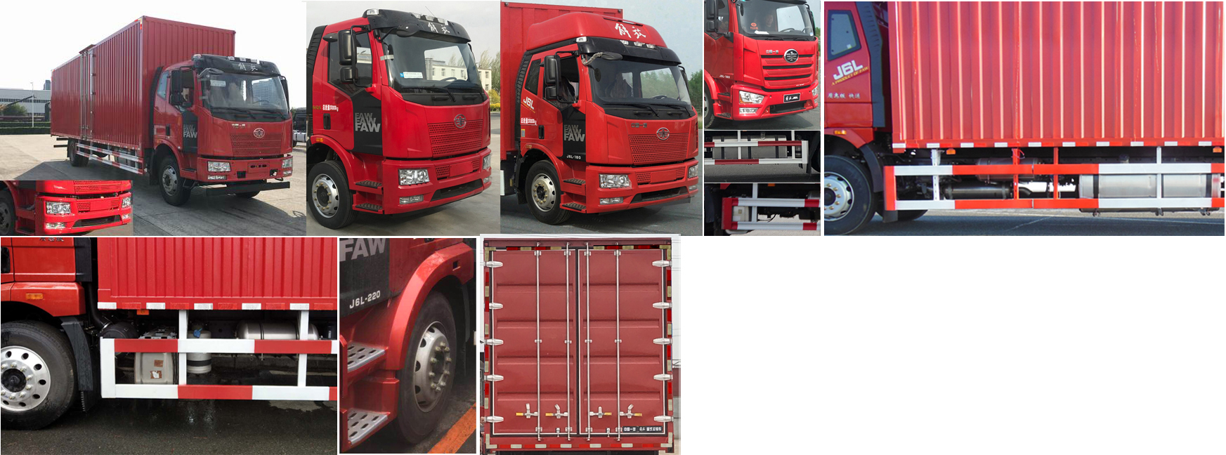 | 备注 | 车厢顶部封闭,不可开启,选装单开门,双开门,不开门,选装平板,彩板,瓦楞板车厢,选装液压尾板,选装车厢侧面两对门,侧面防护装置的横杆及纵梁材料为Q235,螺栓连接,后下部防护装置的横梁及纵梁材料为16MnREL,螺栓连接,断面尺寸120×60mm,离地高度为430mm,选装遮阳罩,导流罩,安装具有卫星定位功能的行驶记录仪,ABS防抱死制动系统生产厂家:长春科密汽车制动有限公司,型号:CM4XL,油耗申报值与发动机对应关系: 29.07(CA4DK1-22E51),29.03(CA4DK1-22E5),29.81(CA6DH1-24E5),30.9(CA6DH1-25E51),尾板收起状态的水平长度295mm,长度尺寸对应关系:12000=1400+7100+3500(10000mm,9700mm厢长),11000=1400+6500+3100(8700mm厢长),选装宽体保险杠和脚踏,选装高顶驾驶室,单排驾驶室,前轴选装盘式制动器,选装限速装置,限速89km/h,随底盘选装前围,灯具,驾驶室准乘人数3人对应额定载质量9305kg,驾驶室准乘人数2人对应额定载质量9370kg,选装车厢外观,后部结构 | ||