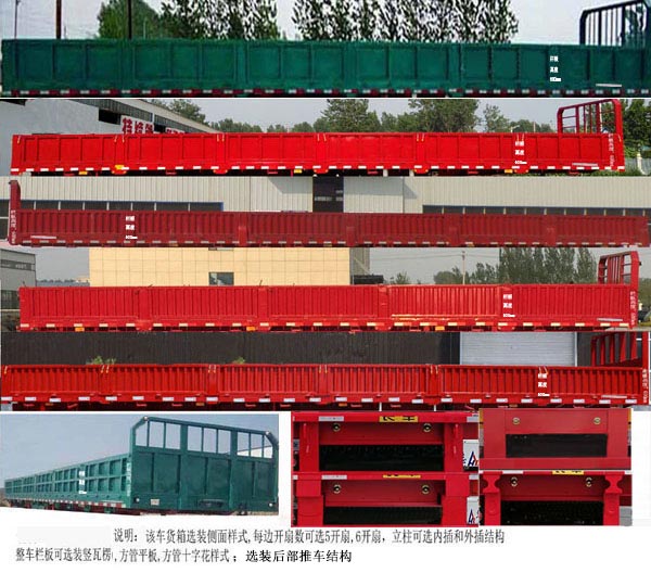 | 备注 | 该车选装大梁异形孔结构;选装侧面样式,每边开数可选5开扇和6开扇,立柱可选内插和外插.整车栏板选装竖瓦楞,横瓦楞,方管平板,方管十字花样式.选装前部样式,选装挡泥板样式,选装后部推车器结构,选装左侧不带工具箱,选装后整备质量变化在3%范围内,车长/货箱内尺寸/轴距/后悬/离去角,对应关系(mm):13000/12820/6680+1310+1310/2400/12.5;13000/12820/6680+1310+1310/2300/13;12500/12320/6480+1310+1310/2100/14.1;12500/12320/6480+1310+1310/2000/14.7;12000/11820/6280+1310+1310/1800/16.2;12000/11820/6280+1310+1310/1700/17.ABS:型号CM2XL-4S/2M,生产厂家:广州科密汽车电子控制技术股份有限公司.选装ABS生产厂家:威伯科汽车控制系统(中国)有限公司型号:400500XXX0.侧防护材质Q235,选装铝合金材质,与车架为螺栓连接,后防护采用Q235,与车架连接方式为焊接. 后防护离地高度为490mm,断面为140mmX60mm。 | ||