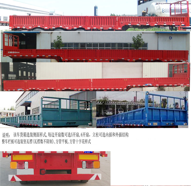 | 备注 | 该车货箱选装侧面样式,每边开扇数可选5开扇,6开扇,立柱可选内插和外插结构,整车栏板可选装竖瓦楞,方管十字花样式,选装后部样式,选装号牌板结构,选装尾部标志板的安装位置,选装前挡板结构;选装大梁异形孔结构,选装后组合灯为方形/雾灯为圆形结构,一,ABS系统生产厂家/型号:广州瑞立科密汽车电子股份有限公司/CM2XL-4S/2M.二,侧下部防护装置及后下部防护装置,材料材质Q235B,连接方式:侧下部防护装置/后下部防护装置用焊接连接,后下部防护装置断面尺寸高为140mm,宽为55mm,离地高度为480mm,车长/轴距/后悬/牵引销至车辆最前端的距离尺寸对应关系:13000/6880+1310+1310/2300/1200,13000/6780+1310+1310/2300/1300,13000/6680+1310+1310/2300/1400,12500/6480+1310+1310/2100/1300,12000/6280+1310+1310/1800/1300 | ||