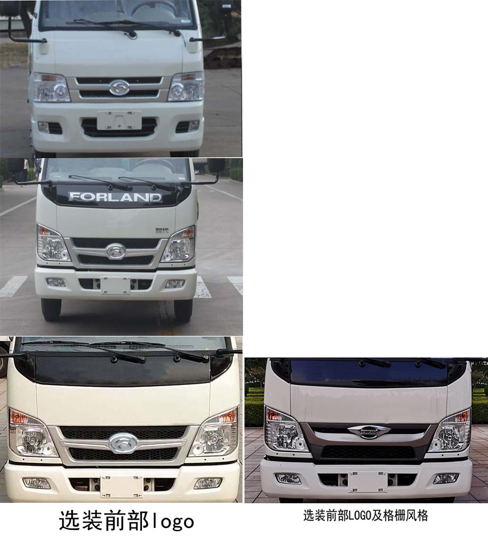 | 备注 | 可选装货厢风格,可选装后部牌照板风格,发动机DAM15KL,DAM16KL对应的油耗值分别为8.6L/100km,8.6L/100km,分别对应最高车速100km/h,110km/h.ABS控制方式为双参数控制,ABS系统控制器型号是YF9,ABS系统控制器生产企业是武汉元丰汽车电控系统有限公司.选装新前围及前部灯具.选装前部无"FORLAND"外部装饰件.选装前部logo.选装前部格栅及LOGO风格. | ||