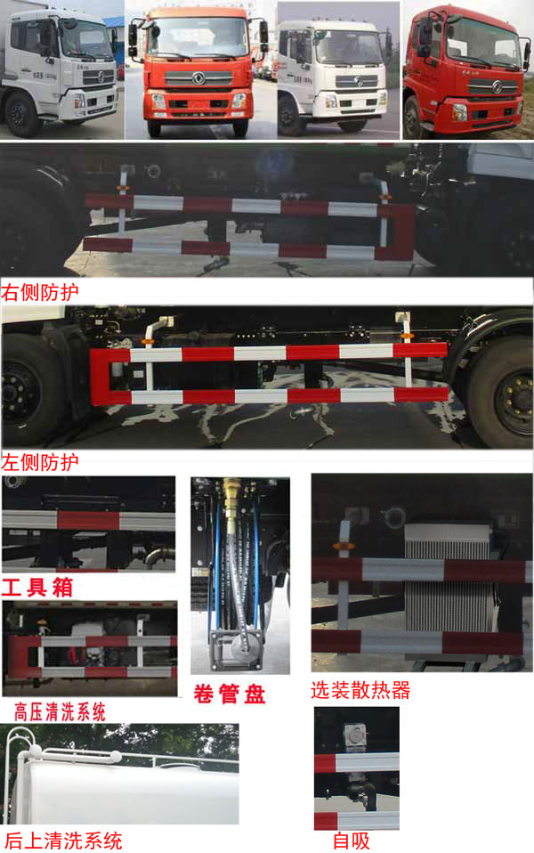 | 备注 | 1、该车型罐体有效容积为10.4立方米,罐体外形尺寸(长×长轴×短轴)为4600×2400×1400(mm);2、该车型有5种装置可供选装:A(基础车型)、B(选装前喷架1)、C(选装前洒水炮)、D(选装定点清洗装置)、E(基础车型取消前喷架);配置/准乘人数(人)/整备质量(Kg)/额定载质量(Kg)/整车长度(mm)/前伸(mm)/接近角(°)对应关系为:A/2/7880/9990/9270/1050/10; A/3/7880/9925/9270/1050/10;B/2/7880/9990/9170/950/10; B/3/7880/9925/9170/950/10;C/2/7460/10410/8820/600/14;C/3/7460/10345/8820/600/14;D/2/7460/10410/8560/340/14;D/3/7460/10345/8560/340/14;E/2/7460/10410/8220/0/14;E/3/7460/10345/8220/0/14;3、该车仅采用4700mm、4500mm轴距,轴距和后悬的对应关系:4700/2090,4500/2290;4、侧防护装置材料为Q355,与车架采用螺栓连接;后防护装置1材料为Q355,与车架采用螺栓连接,截面尺寸为150×50(mm),离地高度480mm;选装后防护装置2,材料为QStE700TM,与车架采用螺栓连接,截面尺寸为160×120(mm),离地高度485mm;5、ABS型号/生产厂家分别为:3631010-C2000/东科克诺尔商用车制动系统(十堰)有限公司;4460046440/威伯科汽车控制系统(中国)有限公司;6、可随底盘选装驾驶室前脸扰流罩,前雾灯和卧铺侧窗装饰板,驾驶室顶灯;7、选装侧喷,后洒外观,后下喷雾,罐体封头新造型,罐体顶部护栏,工具箱,自吸,后上清洗系统,左侧加水口,点喷,后箭头灯外观;8、该车型前喷架、后箭头灯、后上喷雾、前喷架杆灯、散热器、卷管盘、顶部闷盖、前鸭嘴、洒水炮上加压出水口、倒车监控为选装件,可取消;9、该车装有罐体总成专用装置,用于清理路面、管道沉积物或清洗物体。 | ||
