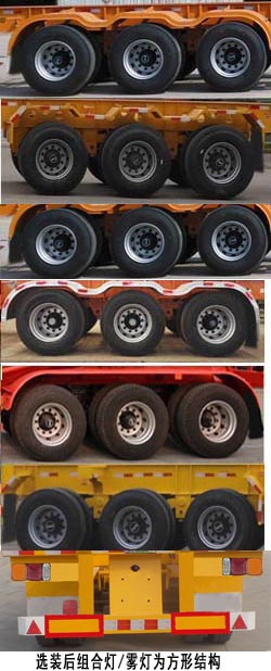 | 备注 | 该车用于运输40英尺集装箱,牵引销处车架总高度210mm,180mm,160mm,140mm,选装不带导向块时高度为1450mm,选装轮胎护瓦样式,选装后部样式,选装尾部标志板的安装位置,选装号牌板样式,选装后组合灯/雾灯为方形结构,一,ABS:型号:CM2XL-4S/2M;生产厂家:广州瑞立科密汽车电子股份有限公司.二,防护:侧/后防护材料采用Q235B,连接方式:侧下部防护装置/后下部防护装置均用焊接连接,后防护离地高度为480mm,断面为140mmX55mm,车长/轴距/后悬/牵引销至车辆最前端的距离尺寸对应关系(mm):12450/7180+1310+1310/2080/570,12450/7080+1310+1310/2080/670,12450/6980+1310+1310/1980/870,12450/6880+1310+1310/1780/1170 | ||