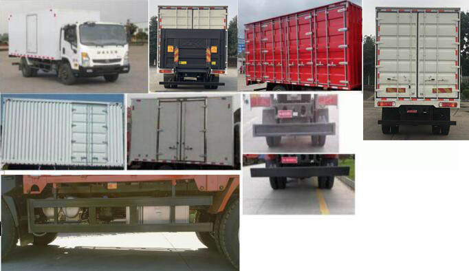 | 备注 | 货箱顶部封闭,不可开启。选装单排驾驶室;选装前面罩、前部灯具、后组合灯具、前保险杠,徽标样式及安装位置;选装导流罩;选装轮罩;选装同尺寸不同风格货箱(瓦楞式,平板式);选装货箱侧面不开门,单开门或双开门,四开门;选装可升降液压尾板,尾板收起状态的水平长度为290mm;选装后防护装置;选装侧防护装置样式.侧防护装置材料为:Q235,螺栓连接,后防护装置离地高度为450mm,后防护材料Q345B,截面高度和厚度为120mm×30mm,(选装120mm×60mm)。驾驶室型式/轴距/货箱长度/整车长度/前悬/后悬对应关系:排半/3300/3850/6100/1220/1580;排半/3550/3850/6100/1220/1330;排半/3550/4180/6490/1220/1720;排半/3900/4850/7080/1220/1960;排半/4100/5200/7350/1220/2030;排半/4100/5200/7490/1220/2170;排半/4400/5750/7995/1320/2275;单排/3300/4180/6100/1220/1580;单排/3550/4180/6100/1220/1330;单排/3550/4500/6490/1220/1720;单排/3900/5200/7080/1220/1960;单排/4100/5600/7350/1220/2030;单排/4400/6050/7995/1320/2275。该车安装具有卫星定位功能的行驶记录仪。ABS生产厂家:威伯科汽车控制系统(中国)有限公司,型号:ABS-E 4S/4M;浙江万安科技股份有限公司,型号:VIE ABS-II。 | ||