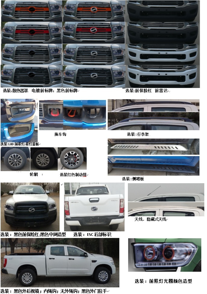 | 备注 | 选装前驻车雷达、前后轮眉、侧踏板、车身同色外门拉手、非电镀外水切、B柱贴膜、黑色侧标牌、护栏A、护栏B、泰式货箱宝、 泰式货箱盖、折叠货箱盖(带货箱锁)、铁灰色后杠、电镀田野标牌、饰框非电镀后组合灯、散热器罩、前保险杠、车身同色后视镜、行车记录仪、无骨雨刷、金色4×4标牌、金色田野标牌、黑色前标牌、电镀前标牌、ESC后部标识、前照灯光圈颜色造型、LED前雾灯、雾灯盖板、轮辋、红色制动钳、行李架、隐藏式天线、拖车钩、黑色中网造型、黑色外后视镜、内绳钩、、黑色外门拉手。前雾灯、昼间行驶灯、侧踏板、护栏、行李架、外绳钩可不装。ABS型号APG3550500G,生产企业浙江亚太机电股份有限公司;ABS型号DBC1200,生产企业京西重工(上海)有限公司。发动机净功率150kW。 | ||