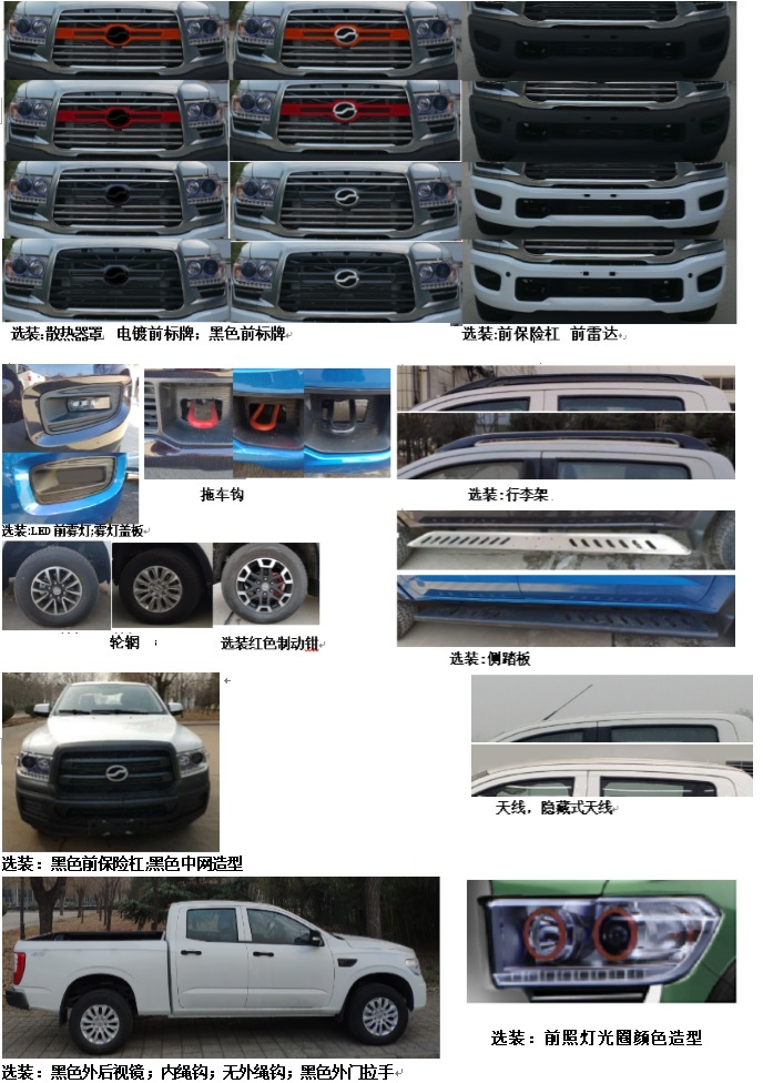 | 备注 | 选装前驻车雷达、前后轮眉、侧踏板、车身同色外门拉手、非电镀外水切、B柱贴膜、黑色侧标牌、护栏A、护栏B、铁灰色后杠、电镀田野标牌、饰框非电镀后组合灯、车身同色后视镜、行车记录仪、无骨雨刷、金色4×4标牌、金色田野标牌、散热器罩、前保险杠、黑色前标牌、电镀前标牌、LED前雾灯、前照灯光圈颜色造型、雾灯盖板、轮辋、红色制动钳、侧踏板、行李架、隐藏式天线、拖车钩、黑色中网造型、黑色外后视镜、内绳钩、黑色外门拉手。前雾灯、昼间行驶灯、护栏、侧踏板、行李架、货箱外绳钩可不装。ABS型号APG3550500G,生产企业浙江亚太机电股份有限公司。发动机净功率150kW。 | ||