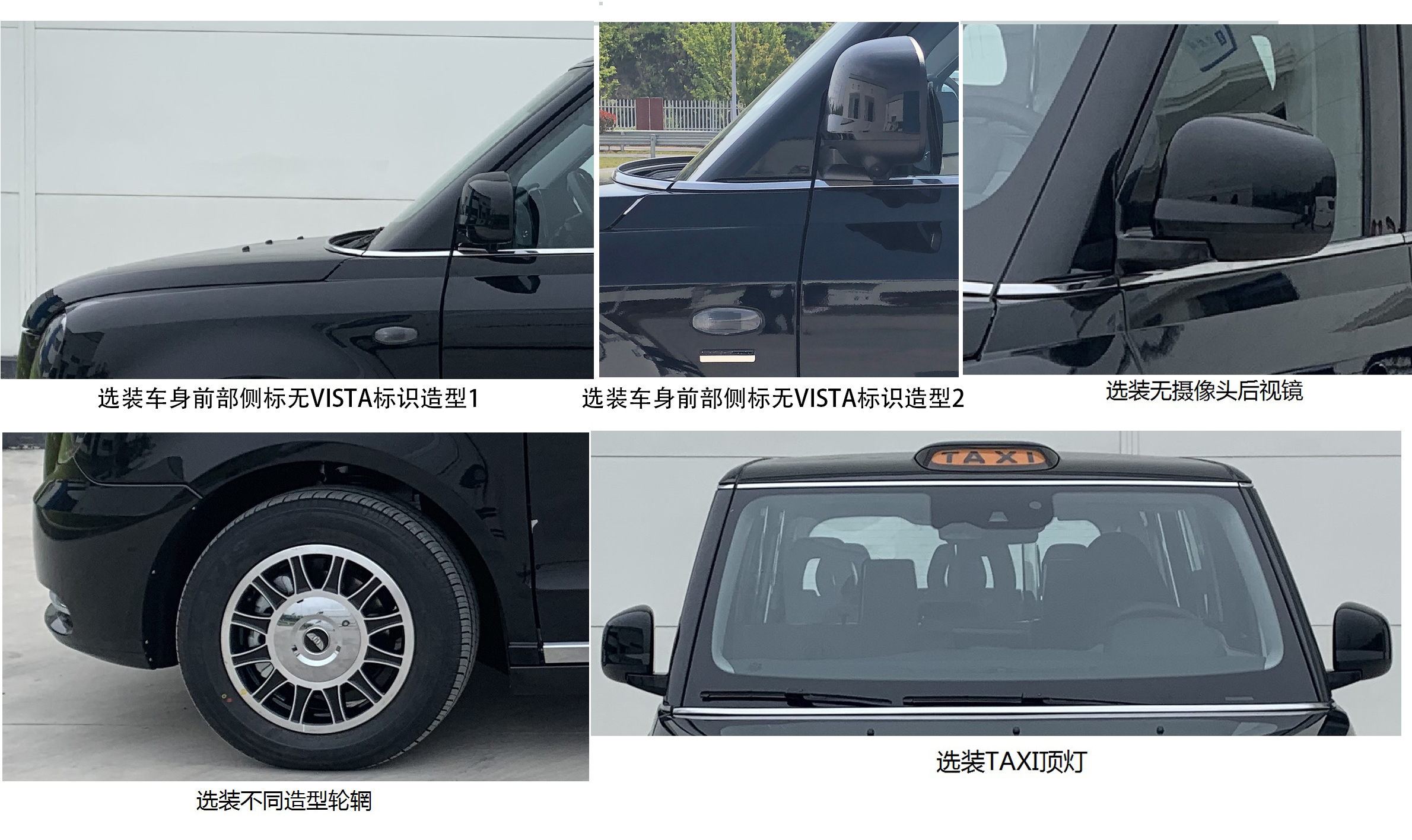 | 备注 | 1.选装不带前后摄像头,前雷达;选装天窗,无摄像头后视镜,无VISTA侧标识,不同造型轮辋,TAXI顶灯;2.装配ABS防抱死系统,生产企业为博世汽车部件(苏州)有限公司,产品型号为ESP9;3.发动机最大净功率为100kW.储能装置种类为三元锂离子动力蓄电池,生产企业为欣旺达电动汽车电池有限公司;4.允许外接充电,具备纯电动模式;5.装备行动不便人员上下车导板装置,轮椅及其使用者的约束系统,供行动不便人员上下车用座椅等专用设备;6.二排座椅为反向折叠座椅. | ||