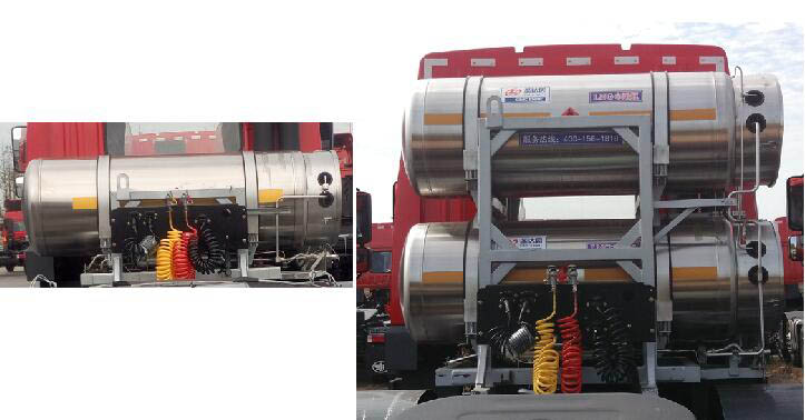 | 备注 | 气瓶保护罩可选装不带.选装新的气瓶支架.选装单一气瓶.发动机净功率/整备质量(Kg)/鞍座承载质量(Kg)/准拖挂车总质量(Kg)为WP12NG350E52(249kW)/8805/16000,16065/40000,WP12NG400E50(286kW)/8805/16000,16065/40000;WP13NG430E52(308kw)/8805/16000,16065/40000,WP12NG350E52(249kW)/9300/15505,15570/39505,WP12NG400E50(286kW)/9300/15505,15570/39505;WP13NG430E52(308kw)/9300/15505,15570/39505.ABS生产厂家:万安科技上海万捷汽车控制系统有限公司,ABS型号: VIE ABS-II.安装具有卫星定位功能的行驶记录仪.适用于牵引危险品运输半挂车,安装限速装置,限速80km/h.选装995L气瓶.选装新结构的挡泥板. | ||