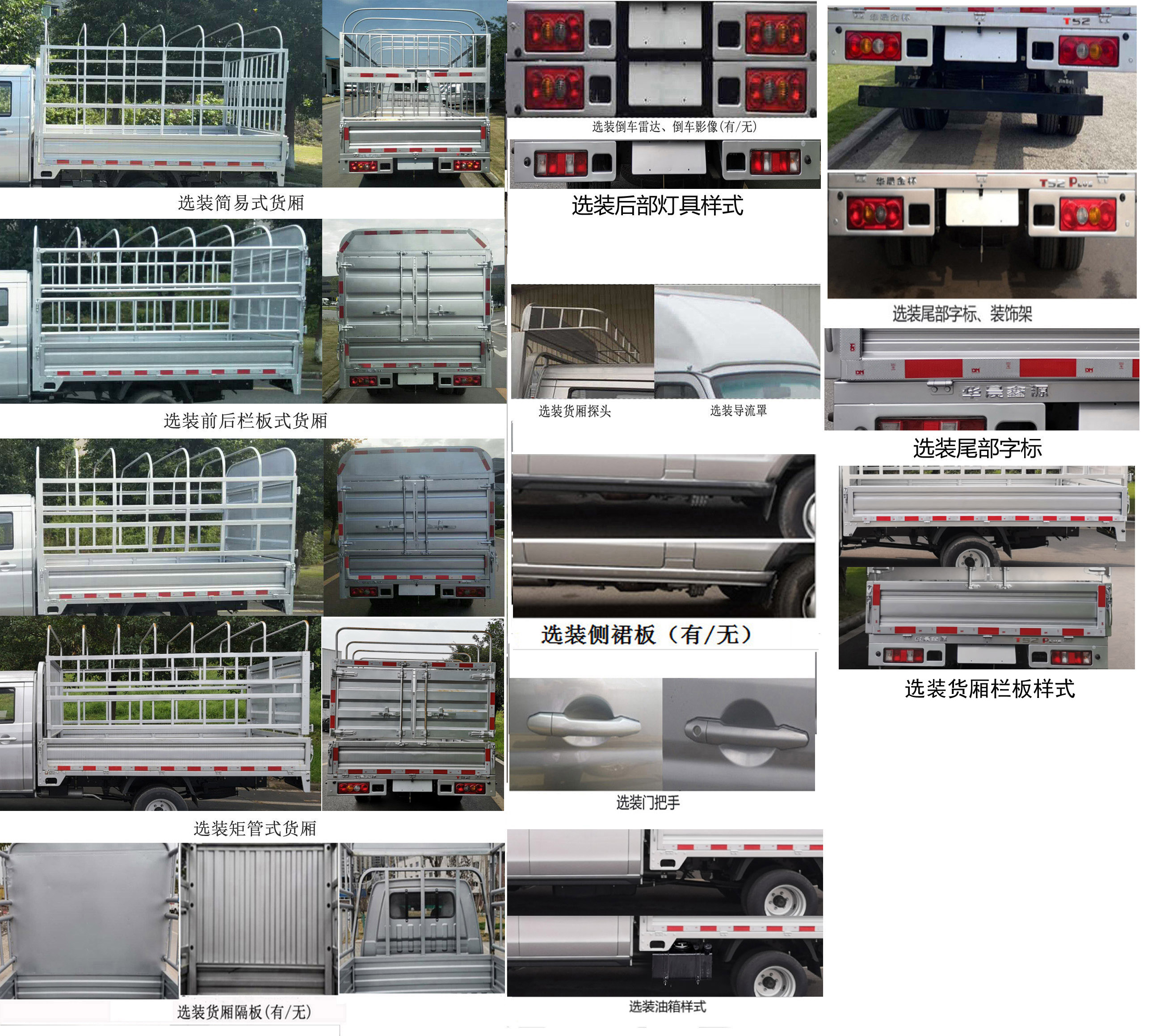 | 备注 | 1.选装(MP5,简易式/前后栏板式圆管/矩管式货厢,货厢探头,导流罩,倒车雷达,倒车影像,侧裙板,后部灯具样式,装饰架,尾部字标,门把手样式,油箱样式,货厢栏板样式);2.装配简易式货厢对应整备质量:1660kg;3.发动机型号SWE20M,最大净功率93kW,整备质量1660kg,1710kg对应油耗申报值为7.9L/100km,8.3L/100km;4.车厢底板到顶部高度1710mm;5.ABS型号/生产企业:YF8/武汉元丰汽车电控系统有限公司;6.该车型符合国六标准b限值要求. | ||
