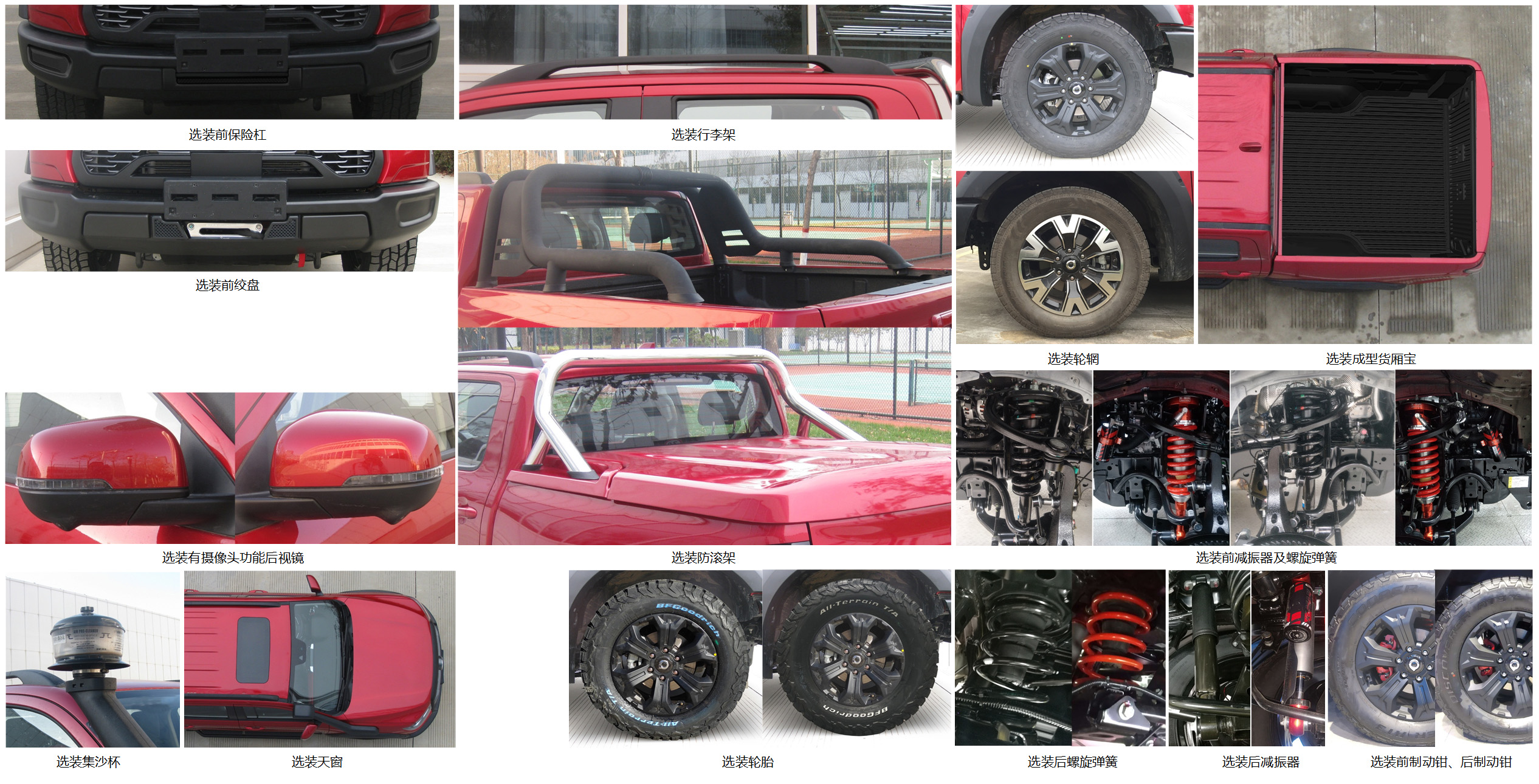 | 备注 | 选装前保险杠,前绞盘,有摄像头功能后视镜,集沙杯(此时车高为1918mm),天窗,行李架,防滚架,轮辋,成型货厢宝,前减振器及螺旋弹簧,后螺旋弹簧,后减振器,轮胎,前制动钳,后制动钳,硬质货厢盖,卷帘式货厢盖,货厢门踏板.整备质量2220kg对应油耗申报值为8.5L/100km,整备质量2295kg对应油耗申报值为8.9L/100km.ABS型号及生产企业:ESP9/博世汽车部件(苏州)有限公司.发动机净功率值为120kW. | ||