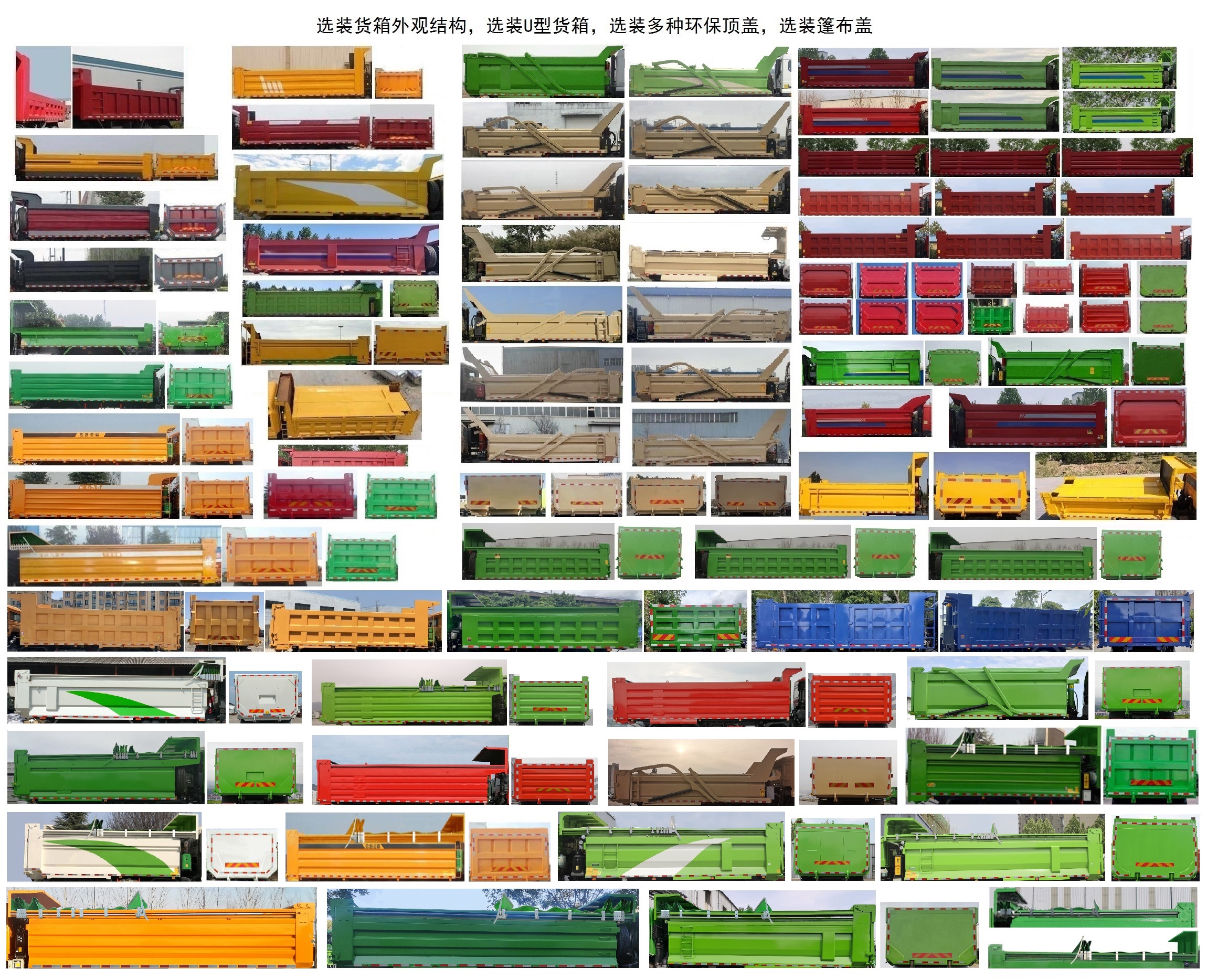 | 备注 | 该车可不选装遮阳罩。选装后视镜。选装昼间行驶灯。选装低位保险杠。选装保险杠外观。选装踏步。选装前拖钩。选装车道偏离报警和车辆前向碰撞预警系统。选装四方位影像系统。该车仅选装二类底盘的1800+3500+1350,1800+3475+1400轴距(单位:mm)。车长与轴距,箱长,后悬参数对应关系如下(单位:mm):9660/1800+3500+1350/6800/1460;9660/1800+3475+1400/6800/1435;9860/1800+3500+1350/7000/1660;9860/1800+3475+1400/7000/1635;9960/1800+3500+1350/7200/1760;9960/1800+3475+1400/7200/1735;10060/1800+3500+1350/7300/1860;10060/1800+3475+1400/7300/1835。货箱自卸方式为后卸。该车可选装货箱外观结构。选装U型货箱,U型箱侧裙板为选装件。选装多种环保顶盖(包括篷布盖)。货箱上前伸的帽檐可取消。侧面防护装置所用材料材质为Q235A,连接方式为螺栓连接;后部防护装置所用材料材质为Q235A,连接方式为螺栓连接+焊接,断面尺寸为120mm×120mm,离地高度为480mm。ABS系统型号为446 004 6300,ABS生产企业为威伯科汽车控制系统(中国)有限公司。安装具有卫星定位功能的行驶记录仪。选装ETC车载装置。选装悬架型式:前后钢板弹簧、前钢板弹簧后橡胶悬架。选装新款面罩。 | ||