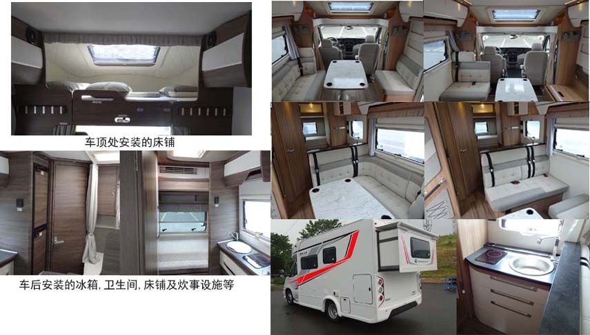 | 备注 | 主要专用装置睡具,电磁炉,冰箱,卫生间等;选装侧面无遮阳棚车宽2380mm;高配车整备质量3960kg,中配车整备质量3880kg,低配车整备质量3805kg;选装小额头车顶造型,选装无前门无上车踏步,无车顶封窗,侧面无部分舱门,无前围裙边包围,选装另一种前围裙边包围,车后尾翼,选装左右两侧及后部不同窗户样式,乘客门及把手样式,空调百叶窗样式;车顶选装摄像机,卫星天线,顶置空调,太阳能板,换气窗,顶封窗等;随底盘选装不带前雾灯,ESP,自动变速箱;侧面防护为客厢式裙边结构,离地高300mm;后防护为原车自带防护装置,位于后裙边包围内部,材料Q235,槽形, 螺栓连接,断面尺寸120mm×90mm,离地高410mm.ABS型号:BOSCH ABS9,生产企业:BOSCH公司.发动机最大净功率105kW.选装ETC.该车后部部分车厢在车钥匙未通电状态时能向外扩展,当车钥匙通电后则不能扩展 | ||