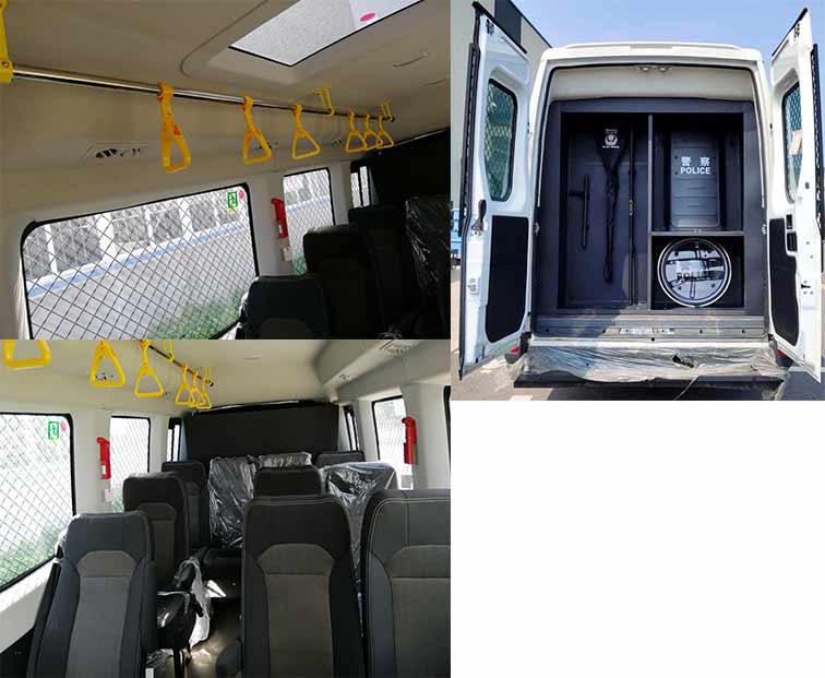 | 备注 | 车辆配备器械柜、防暴盾、防暴叉、警棍等专用装置,主要用于警员、官兵运输。随底盘选装侧标志灯,侧回复反射器;随底盘选装高位制动灯,顶部无选装时车高2715mm,顶部装顶置空调时车高2955mm,顶部装云台摄像机时车高3005mm,顶部装车顶搜索灯时车高3165mm;ABS系统控制器型号:BOSCH ABS9, ABS系统控制器生产企业:BOSCH公司。发动机最大净功率装F1AE8481D时:93KW,装F1CE8481K时:123kW;装备带卫星定位功能的行驶记录仪。该车可选装ETC。 | ||