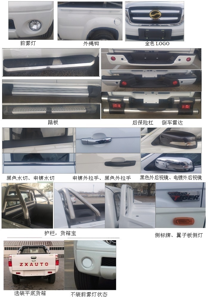 | 备注 | ABS型号:ESP9 EV5010,APG3550500G;ABS生产企业:博世汽车部件(苏州)有限公司,浙江亚太机电股份有限公司;发动机净功率值:110Kw;选装部件名称及其相关描述:选装外绳钩、前雾灯、踏板、翼子板侧灯、后保险杠、护栏、倒车雷达、货箱宝、黑色外拉手、黑色水切、黑色外后视镜、电镀外后视镜、电镀外拉手、电镀水切、安全气囊、金色LOGO、后部标识、“ZXAUTO"后部标贴、平底货箱。外绳钩、前雾灯、倒车雷达、货箱宝、“ZXAUTO"后部标贴、安全气囊可不装。该车型可选装ETC车载装置。; | ||