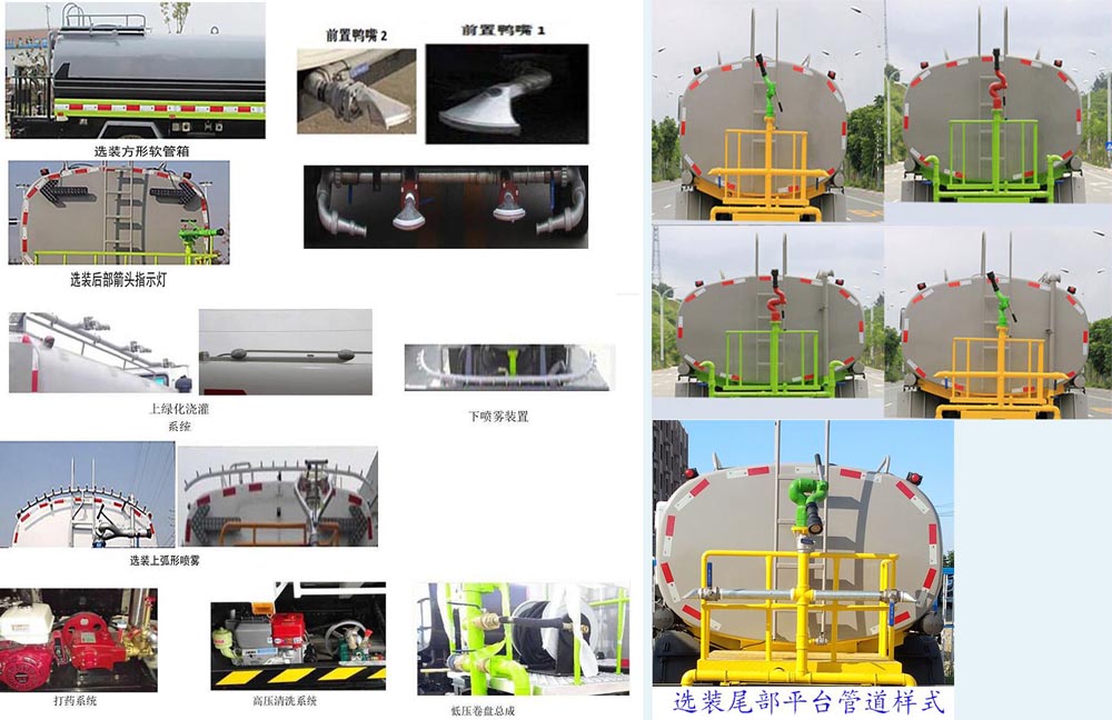 | 备注 | ABS型号:3631010-C2000,VIE ABS-Ⅱ;ABS生产企业:东科克诺尔商用车制动系统(十堰)有限公司, 浙江万安科技股份有限公司;选装描述:随底盘选装驾驶室,选装排气管样式,选装方形软管箱,前置鸭嘴样式,后部箭头指示灯,上绿化浇灌系统,下喷雾装置,上弧形喷雾及专用装置结构,选装后喷雾装置,选装尾部平台管道样式,选装底盘附件位置;所用材料材质、连接方式以及后部防护装置的主要尺寸参数(断面尺寸和离地高度):侧防护采用Q235,螺栓连接。后防护采用Q235,焊接连接。后防护截面高度尺寸150mm,截面宽度尺寸50mm,下边缘离地高度450mm;罐体有效容积(立方米)、罐体外形尺寸(mm):罐体有效容积:11.24立方米,罐体尺寸(长×长轴×短轴mm):5000×2200×1450;专用功能及装置:该车用途为绿化喷洒作业,主要装置为水罐及喷洒装置;其他说明:仅采用轴距:4500mm,外形尺寸长/前悬/后悬(mm)对应关系:8425/1475/2450,8425/1515/2410,8425/1320/2605,8270/1475/2295,8270/1515/2255,8270/1320/2450,仅采用发动机:D4.0NS6B195,B6.2NS6B210,DDi50E220-60,YCS06200-60,YCS04180-68,B6.2NS6B230,YCS06220-60; | ||