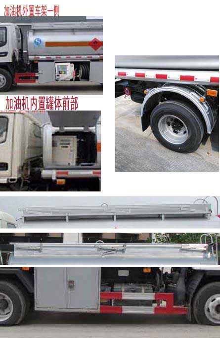 | 备注 | 该车适用于危险品运输,运送危险货物车辆类型为:FL型,类项号:3;罐体有效容积4.95立方米,介质:汽油,密度:700千克/立方米;该车加油机位置可选装,罐体外形尺寸(长×长轴×短轴)(mm)分别为:①加油机侧装在车架左侧或右侧:3900×1680×1130;②加油机装在罐体前部:4000×1800×1285(加油机仓长800),4000×1750×1150(加油机仓长900).随底盘选装框架式组合视镜及补盲镜,罐体上部选装折叠护栏,选装无上走道,选装弧形挡泥板,选装左右两侧尺寸相同的单开和双开门工具箱.侧后防护采用Q235材质焊接连接,后部防护断面尺寸(mm):50×320,后部防护离地高度(mm):450.加油机装置型号及生产企业:BL1111Z/珠海市贝林加油设备有限公司中山分公司,HS1812B、HS2812B /托肯恒山科技(广州)有限公司,SKES-1112/恒和嘉华科技有限公司(上海伯莱机械有限公司),SK20QF-111A、SK20QF-222A/郑州三金石油设备制造有限公司,CS20D1110F/正星科技有限公司,JSK-70B1121CZ、JSK-70B1121C、JSK45B1121C/稳恩佳力佳(北京)石油化工设备有限公司,XTST121BF1/邢台正润通科技发展有限公司,ZH3111/佛山市众泽机电科技有限公司.采用排气管前置,前盘式制动器的底盘,安装限速装置,限速80km/h,安装带卫星定位功能的行驶记录仪,ABS控制器型号及生产企业:CM4XL-4S/4M,广州科密汽车电子控制技术股份有限公司. | ||