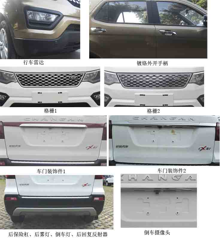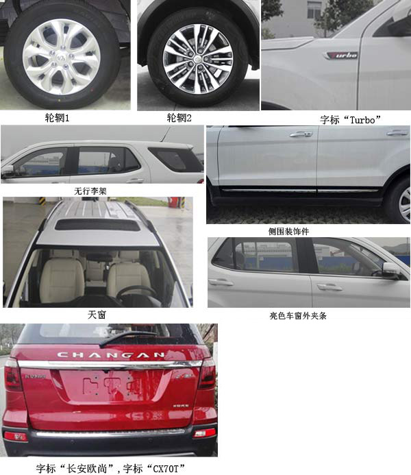 备注 | 选装(格栅1,格栅2,行车雷达,行李架,天窗,字标“Turbo”,轮辋1,轮辋2,倒车摄像头,镀铬外开手柄,亮色车窗外夹条,侧围装饰件,车门装饰件1,车门装饰件2 ,字标“长安欧尚”,字标“CX70T”,后保险杠,后雾灯,倒车灯,后回复反射器).ABS系统控制器型号:MK78,ABS系统控制器生产企业:大陆泰密克汽车系统(上海)有限公司.ESC系统控制器型号:MK100 ESC, ESC系统控制器生产企业:大陆泰密克汽车系统(上海)有限公司.发动机最大净功率100kW. |