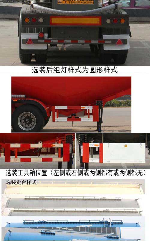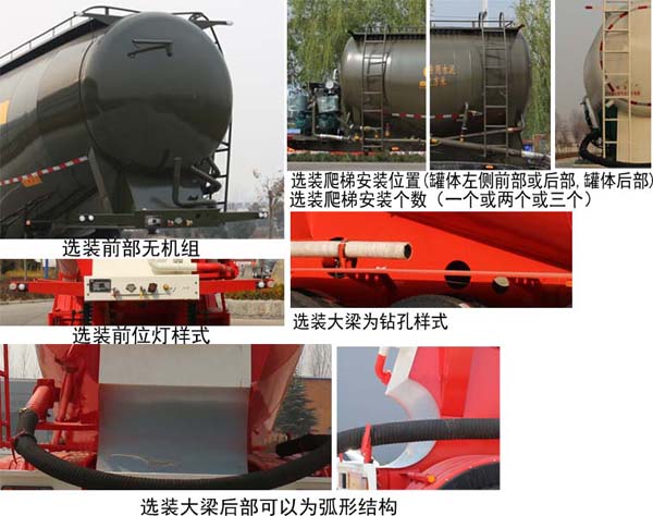 | 备注 | 罐体有效容积:28.3立方米,运输介质:固井专用水泥;罐体外形尺寸:罐体长(含封头)8548mm,宽2500mm,高2900mm,前后封头直径为1808mm,选装前后封头直径为:1908mm;ABS系统生产厂家:广州瑞立科密汽车电子股份有限公司,梁山顺安达汽车科技有限公司,型号:CM2XL-4S/2M,SAD-ABS4S/2M;侧面及后下部防护装置所用材料材质为:Q235,侧防护连接方式为:螺栓连接,后防护连接方式为:焊接,后部防护装置的主要尺寸参数:断面尺寸(mm)为120×68,离地高度为:500mm.罐体顶部封闭不可开槽,后部不可开启;外形尺寸(长)/牵引销到车辆最前端距离/轴距/后悬(mm)对应关系为:9500/1470/4560+1310+1310/850,9500/1230/4800+1310+1310/850,8720/690/4560+1310+1310/850,8720/450/4800+1310+1310/850;选装大梁后部为弧形结构,选装爬梯安装位置(在罐体左侧前部或后部,或是罐体后部),选装爬梯个数(一个或两个或三个),选装前后封头处进气管位置和个数,选装罐体罐道的样式,选装前位灯型号,选装车辆前部无机组时,外形尺寸长为(mm):8720,选装工具箱位置(一侧或两侧或两侧都无),选装大梁为钻孔样式,选装后部灯具样式为圆形样式,选装走台样式. | ||