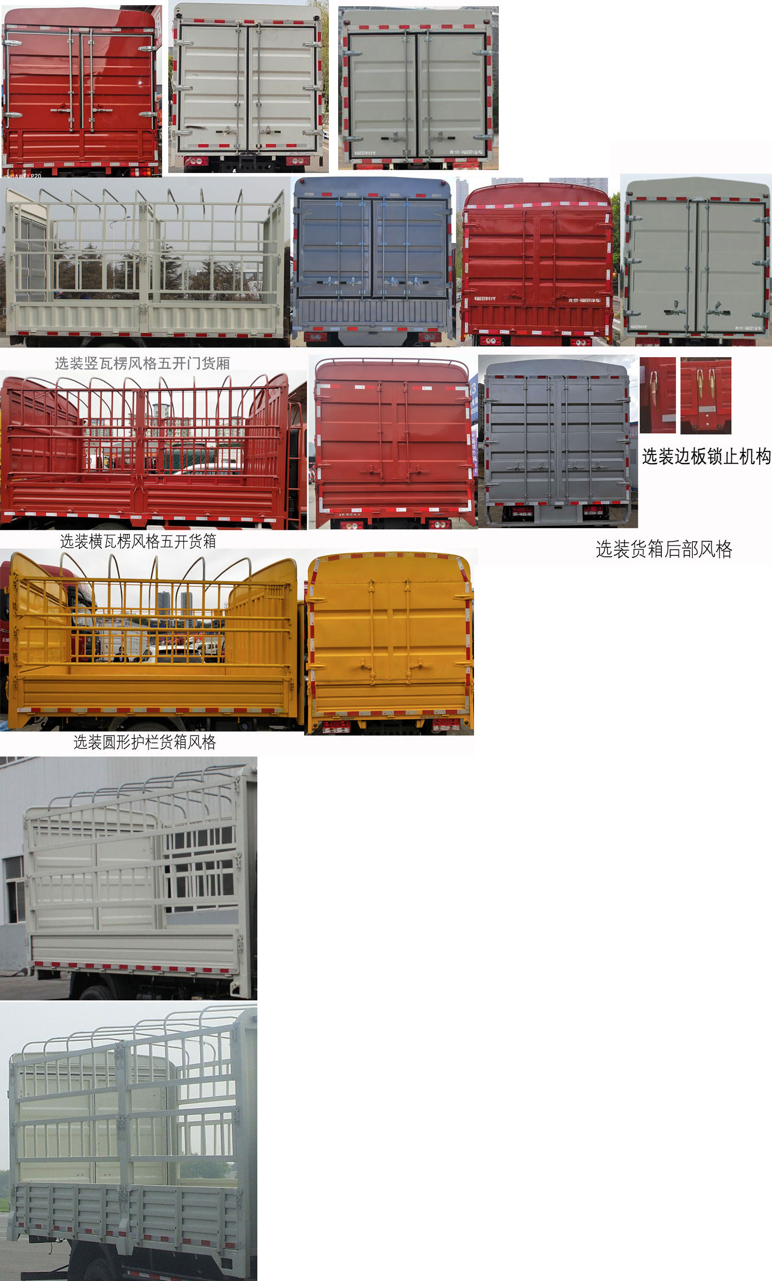 | 备注 | 货厢底板到仓栅顶部高度为2100mm,2300mm,侧面防护装置的所用材料材质为冷板B-2.0-GB/T708,后下部防护装置的所用材料材质为异型管20-D-1-100×50×3,支架材料为热板A-6/Q235A,连接方式为螺栓连接,位置不可调整,后部防护装置的断面尺寸为100×50mm,离地高度为372mm.ABS型号为CM4XL-4S/4M,生产厂家为广州瑞立科密汽车电子股份有限公司,发动机D30TCIE4,ISF3.8s5154,WP3NQ160E50对应油耗值分别为12.0,12.2,12.0.选装新前围及前部灯具,选装排半驾驶室.选装导流罩.选装外置加强筋五开门货厢,选装内置加强筋三开门货厢. | ||