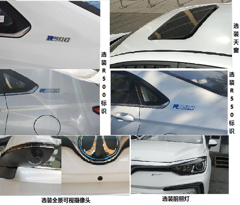 | 备注 | 储能装置的种类:三元锂离子电池,生产企业:北京普莱德新能源电池科技有限公司(总成)/宁德时代新能源科技股份有限公司(单体);电机额定率:80kW,峰值功率:160kW;选装侧气囊、侧气帘、天窗、灯具、前后保险杠、后部EV标识、R500标识、轮毂造型、黑色及车身同色裙边;ABS型号:D8601A,D8601B,生产企业:博世汽车部件(苏州)有限公司。 | ||
