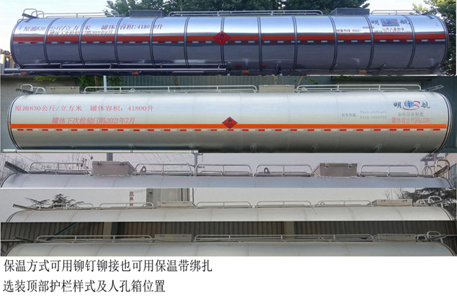 | 备注 | 罐体有效容积为41.8立方米,类项号为3;运输车辆类型:FL,保温内罐体尺寸(mm):11600×2408×1912(长×宽×高),保温层厚度45mm,保温外罐体尺寸(mm):11690×2498×2002(长×宽×高),保温方式可用铆钉铆接,也可用保温带绑扎;ABS系统生产厂家:威伯科汽车控制系统(中国)有限公司,型号:4005000810(4S/2M);选装ABS厂家:广州瑞立科密汽车电子股份有限公司,ABS型号为CM2XL-4S/2M;侧后防护所用材料材质均为铝合金,与车体均为螺栓连接;后部防护装置的断面尺寸:160mm×60mm(高×宽),离地高度为520mm;选装挡泥板样式(含防飞溅装置)、选装后置清罐法兰一套、选装后部爬梯位置及样式、选装顶部护栏样式及人孔箱位置。采用适用于牵引危险品运输半挂车的牵引车。 | ||